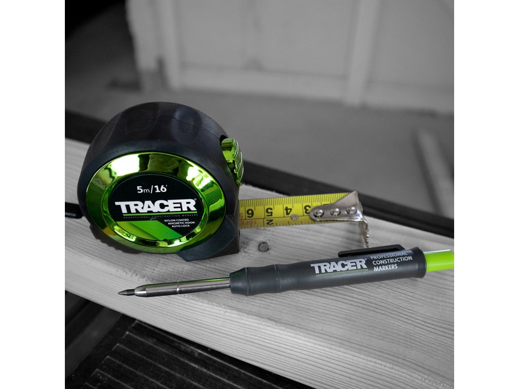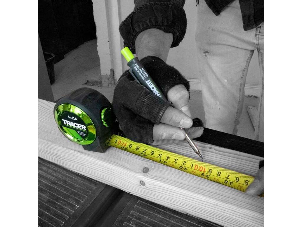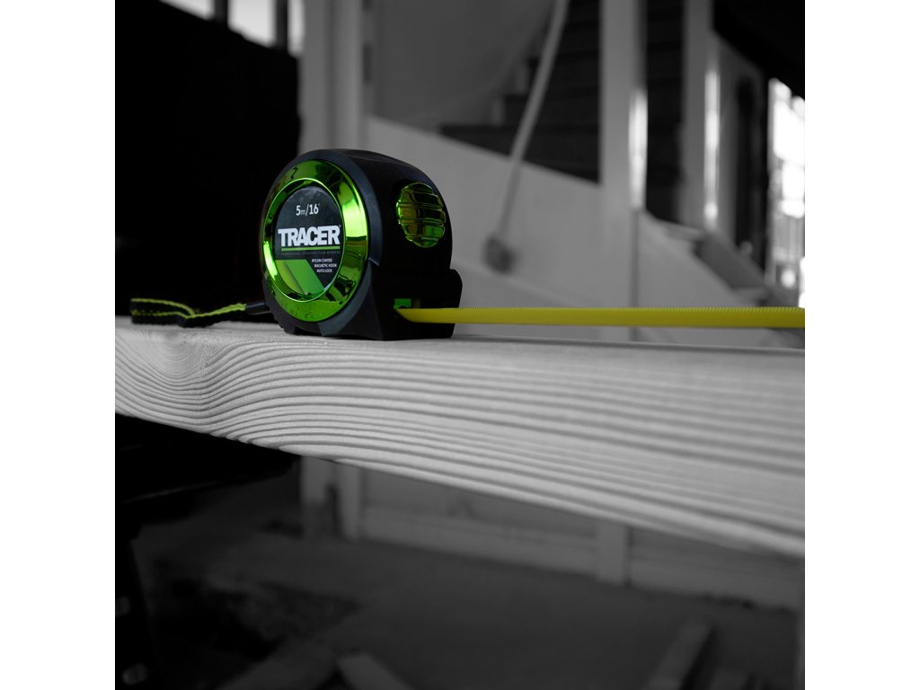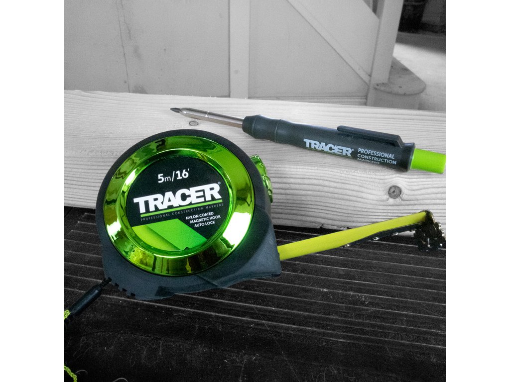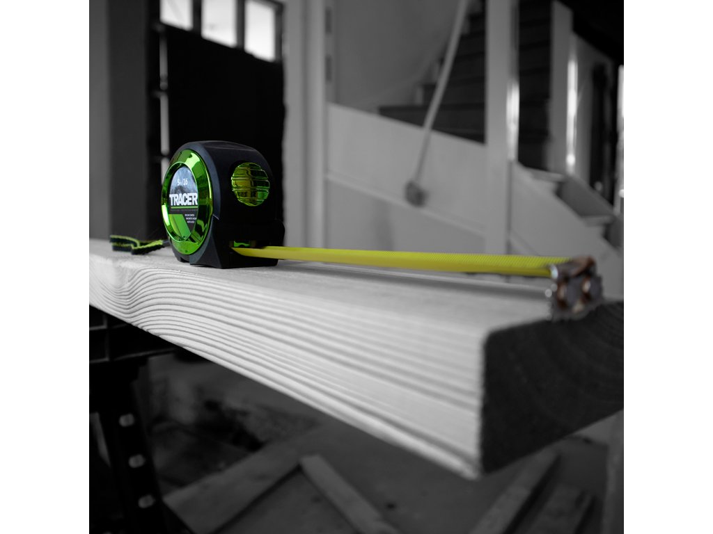 Bandă de măsură de la marca Tracer, care facilitează măsurarea datorită detaliilor sale inteligente. Un instrument de măsurare de calitate complet cu funcție de blocare automată a înfășurării și cârlig magnetic.