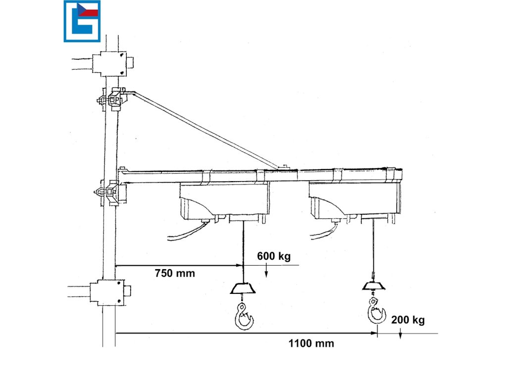Braț din oțel basculant cu o capacitate maximă de încărcare de 600 kg, proiectat pentru agățarea în siguranță a ascensoarelor electrice cu frânghii (→ compatibil cu modelele GSZ 100/200, GSZ 200/400, GSZ 300/600).