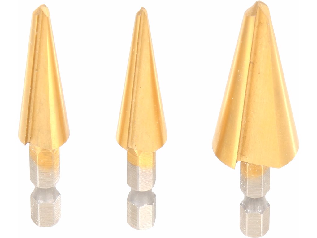 Set de burghie cu strat de TiN potrivit pentru găurire în materiale subțiri (table ș.a.m.d.) – nu se ajunge la „mușcare″ și la abateri circulare ca la burghie obișnuite. Prindere 1/4" HEX. Dimensiunile burghielor: 4,8 – 12,7; 6 – 20 și 3,2 – 12,7 mm. Execuție din oțel HSS clasa M2.