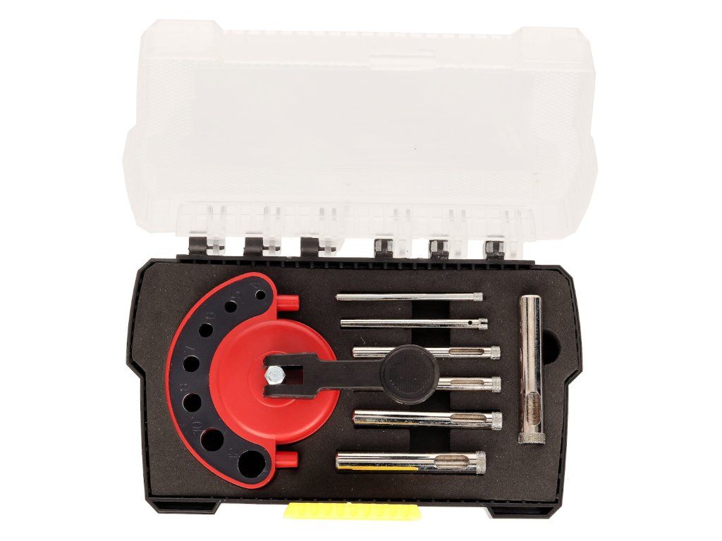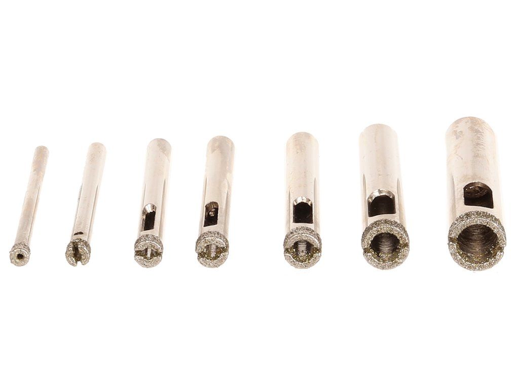 - 7 burghie diamantate tip coroană cu diametre: 4 mm, 5 mm, 6 mm, 7 mm, 8 mm, 10 mm și 12 mm