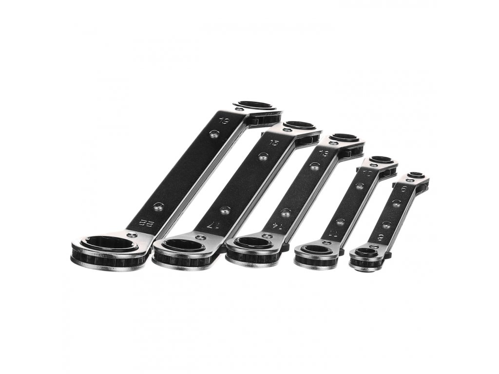 Set de chei cu clichet pentru prize, cu două părţi, îndoite la 25°. Setul include următoarele chei: 6 × 8; 10 × 11; 13 × 14; 15 × 17 şi 19 × 22 mm.