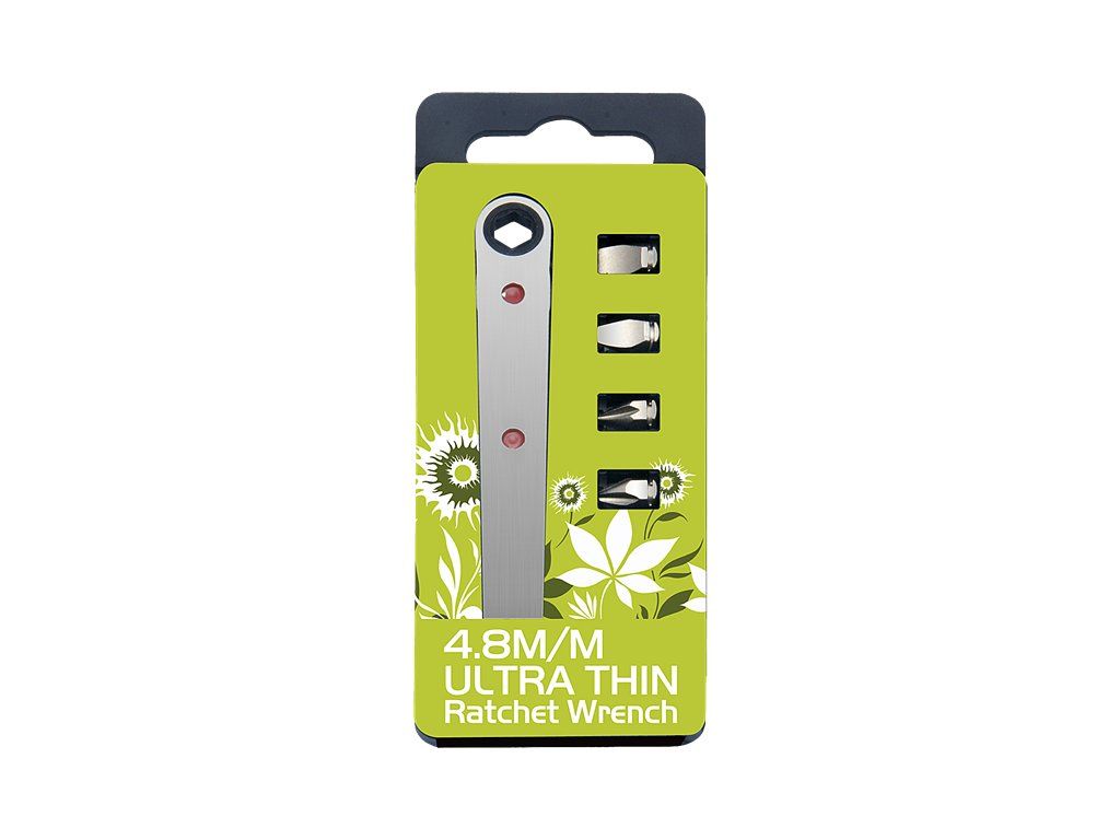 Această cheie cu clichet ultra subțire puteți folosi peste tot unde nu aveți acces cu șurubelnițe obișnuite. Grosimea acesteia este de doar 4,8 mm, moment de torsiune 11,75 Nm, comutare funcționare S/D, pas de 20 dinți. Setul conține cheie ultrasubțire, biți (PH1, PH2, plate 3, 5) și boxă din plastic cu bolț pentru scoatere ușoară a biților.