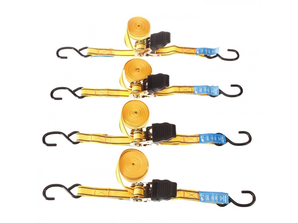 Set de chingi de legare din patru piese. Clichet din oţel galvanizat. Lungime chingă 5 m, lăţime 25 mm, capacitate de fixare 225 kg, rezistenţă la tracţiune 450 kg.