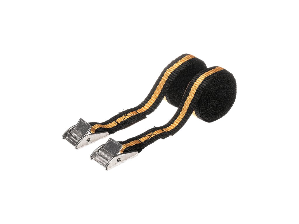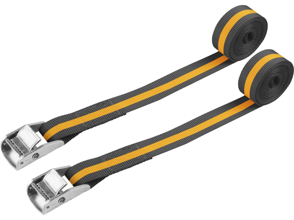 Set de chingi din material textil din două piese pentru securizarea rapidă şi sigură a încărcăturilor transportate pe remorci, în pick-up-uri sau camioane etc. Clips metalic cu mecanism de blocare şi strângere. Lungime chingă de 2,5 m, lăţime 25 mm, capacitate de fixare 100 kg, rezistenţă la tracţiune 200 kg.