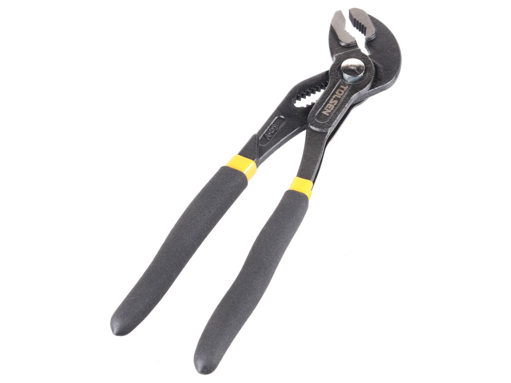 Cleşti din oţel CrV, suprafaţă înnegrită, orificiu 34 mm cu fălcile strânse, mânere din plastic, lungime totală 270 mm.