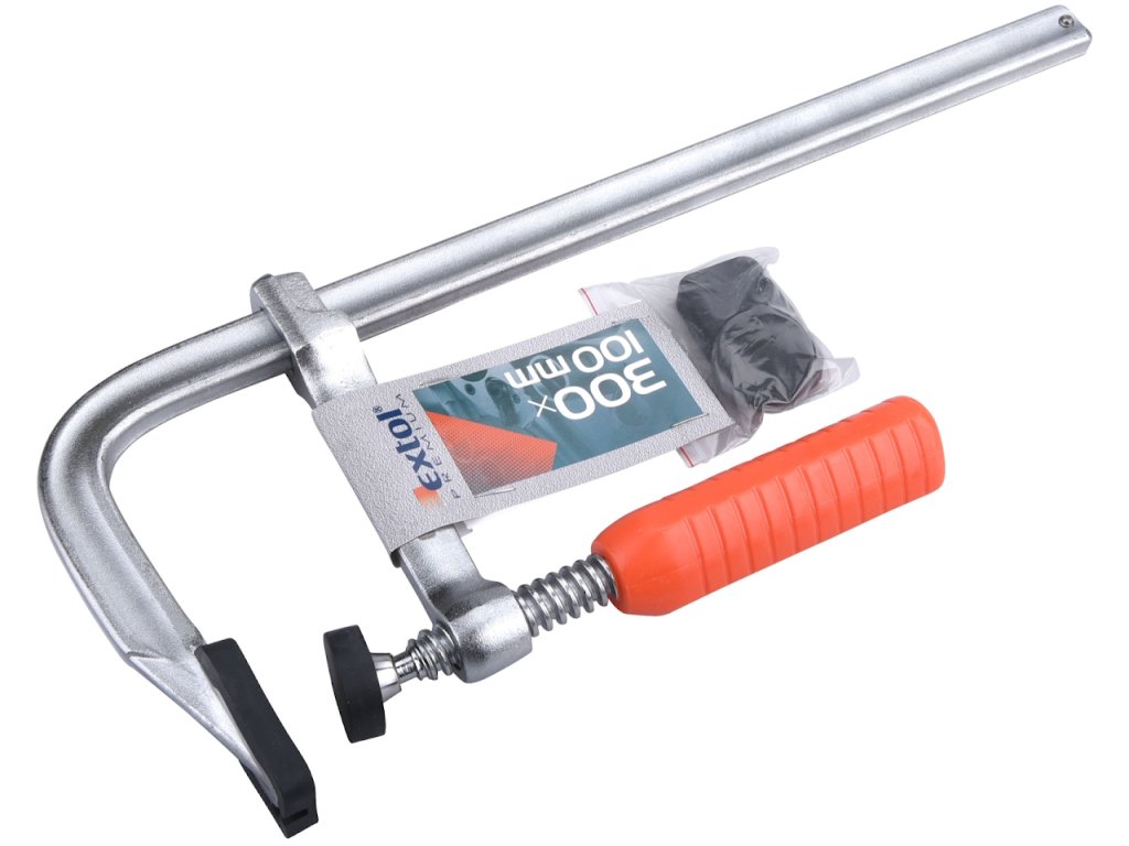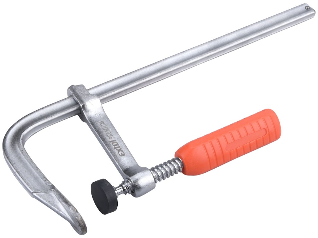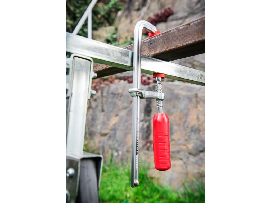 Clemă tâmplărie tip "F" - profil masiv monobloc turnat, suprafeţele de contact acoperite cu plastic, mâner ergonomic din plastic.
