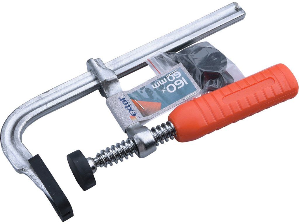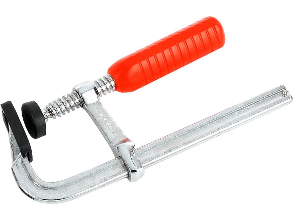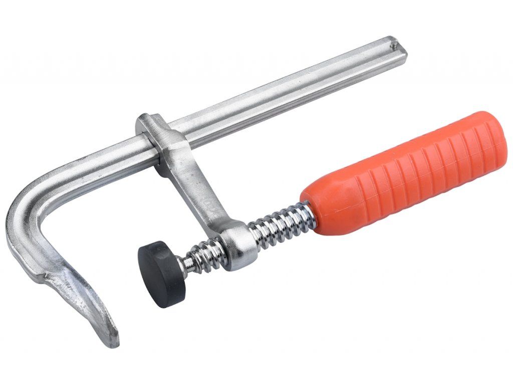 Clemă tâmplărie tip "F" - profil masiv monobloc turnat, suprafeţele de contact acoperite cu plastic, mâner ergonomic din plastic.