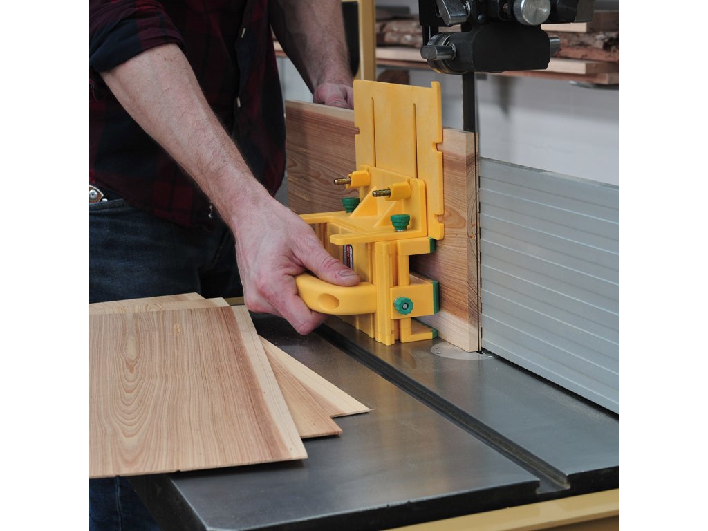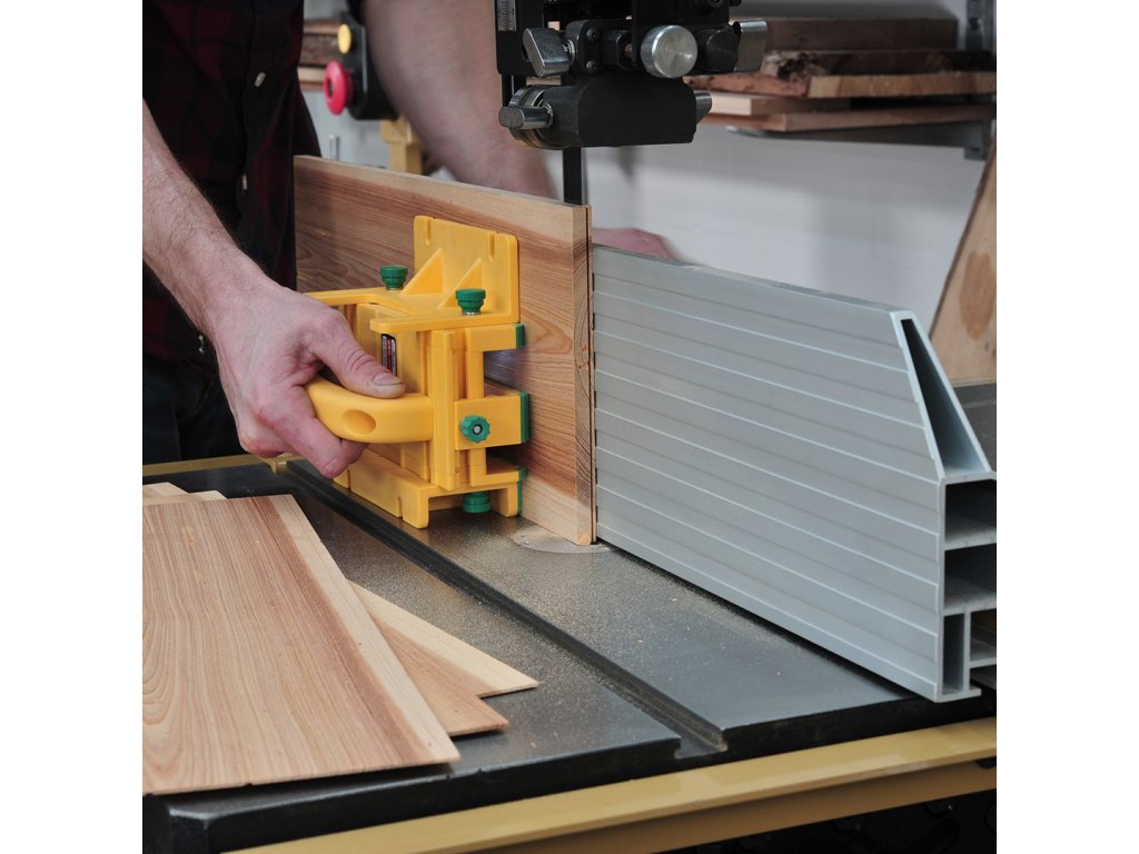 Baza și corpul GRR-RIPPER-ului mențin un unghi constant de 90 de grade. Cu toate acestea, dispozitivul poate fi folosit și pe lateral, ceea ce este ideal pentru tăierea pe ferăstraie cu bandă. GRR-RIPPER alunecă de-a lungul mesei și aplică o presiune uniformă asupra benzii ferăstrăului în timp ce ține mâinile departe de lama ferăstrăului. Chiar și presiunea înseamnă mai puțină mișcare a pânzei de ferăstrău, rezultând tăieturi mai fine.