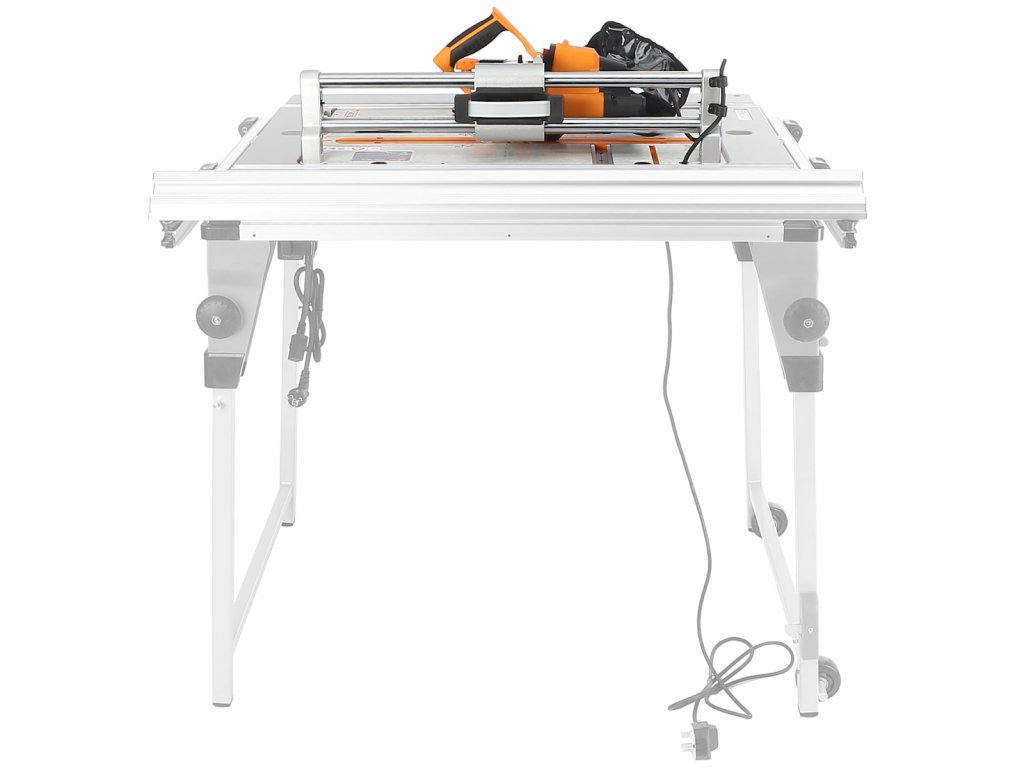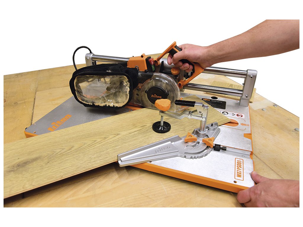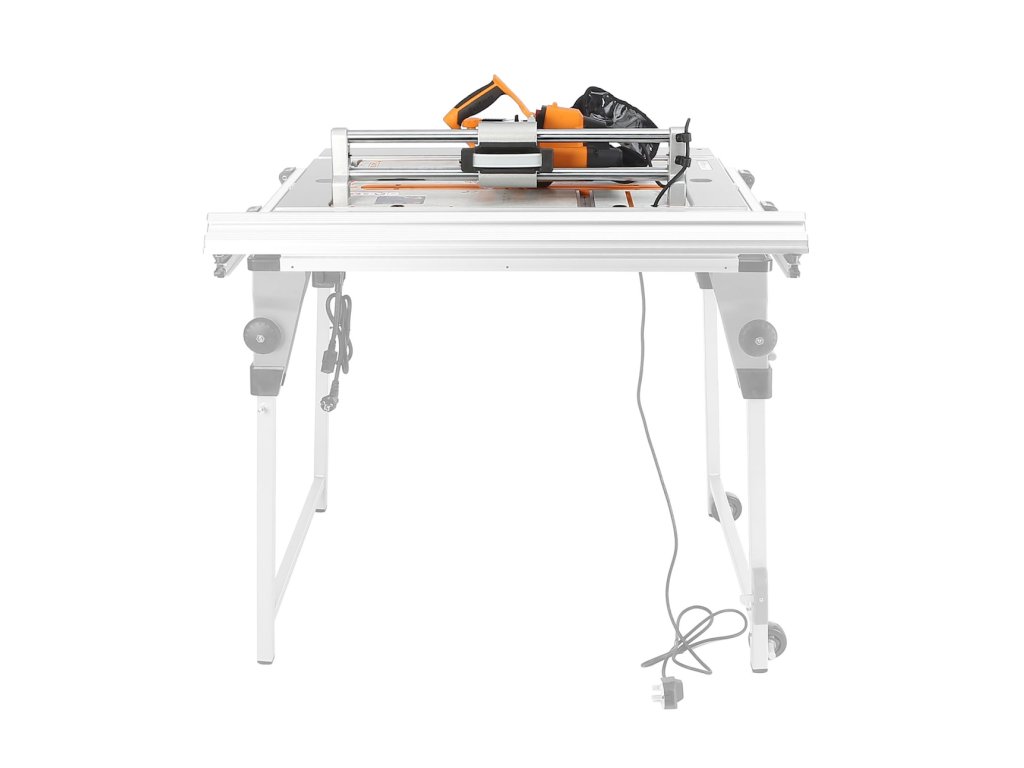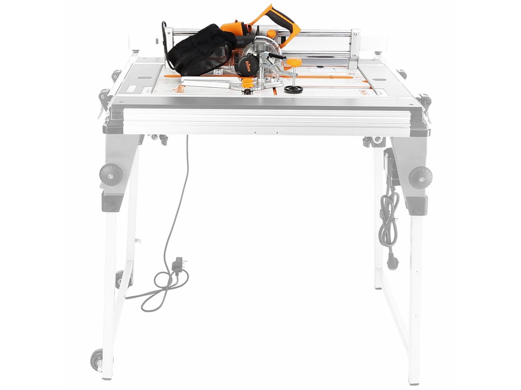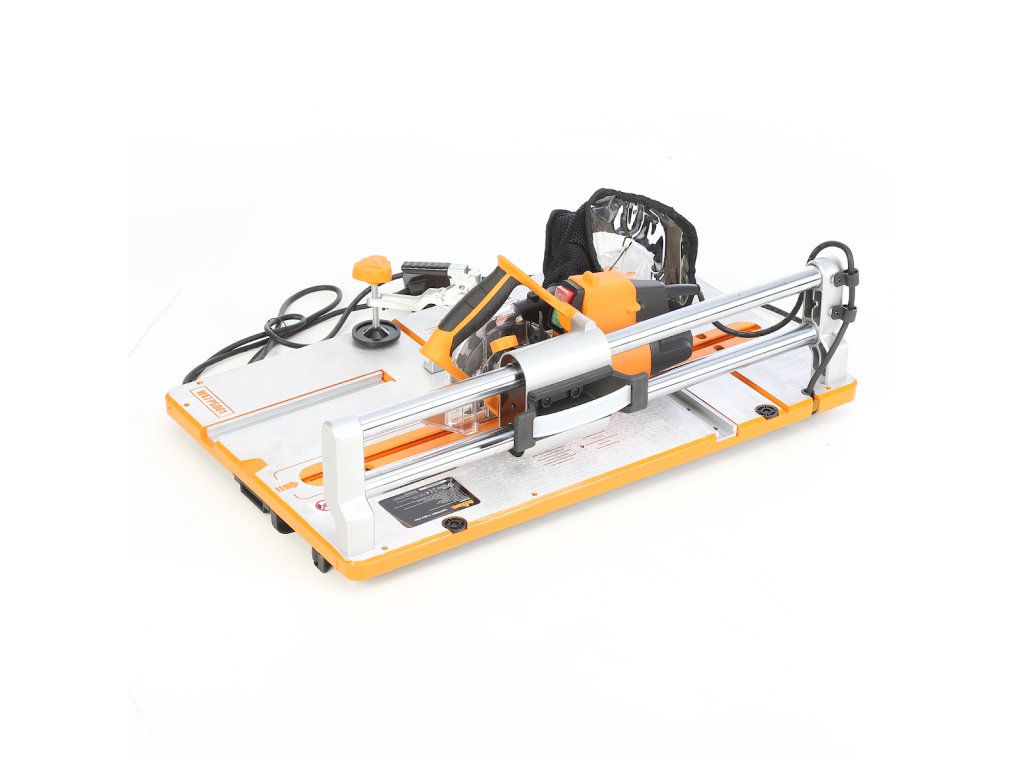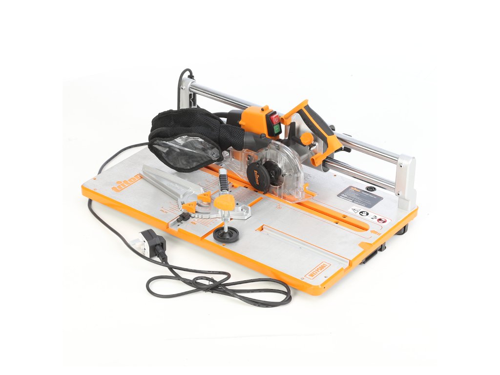 Fierăstrău puternic 910 W cu disc de diametru 127 mm operabil prin manevrare liberă şi fixare de masa de lucru, care funcţionează fie ca instrument de masă fie în agregare cu centrul de prelucrare TWX7. Baza din aluminiu turnat, cu scală metrică şi în inch, ghidaj dublu din oţel. Disc Ø 127 × Ø 17 mm × 14 dinţi. Ferăstrăul poate fi fixat pe masă sau utilizat în utilizare liberă, pentru o varietate de tăieri oblice şi transversale, dacă se utilizează cu opritorul de unghi furnizat cu clemă rapidă încorporată. Adâncime de tăiere de până la 22 mm. Ideal pentru tăieri precise şi rapide într-o varietate de materiale, inclusiv laminat, pardoseli, mulaje decorative şi plinte. Include disc, opritor pentru unghi, clemă rapidă, sac de praf, cheie pentru disc, instrument pentru deplasarea materialelor şi material de montaj pentru extensia TWX7.