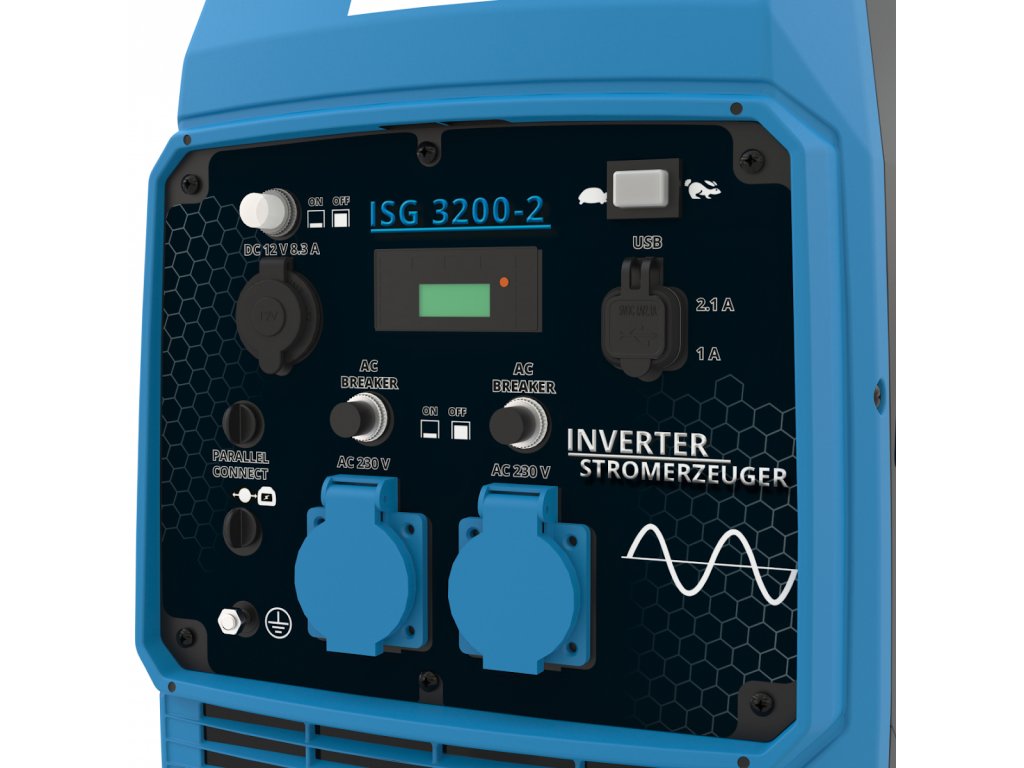 Funcția ECONOMY CONTROL (controlul electronic al vitezei motorului în funcție de sarcina instantanee a unității centrale) • protecție împotriva supraîncărcării circuitului de ieșire • putere crescută prin conectarea cu un alt ISG 3200-2 (prin cabluri).