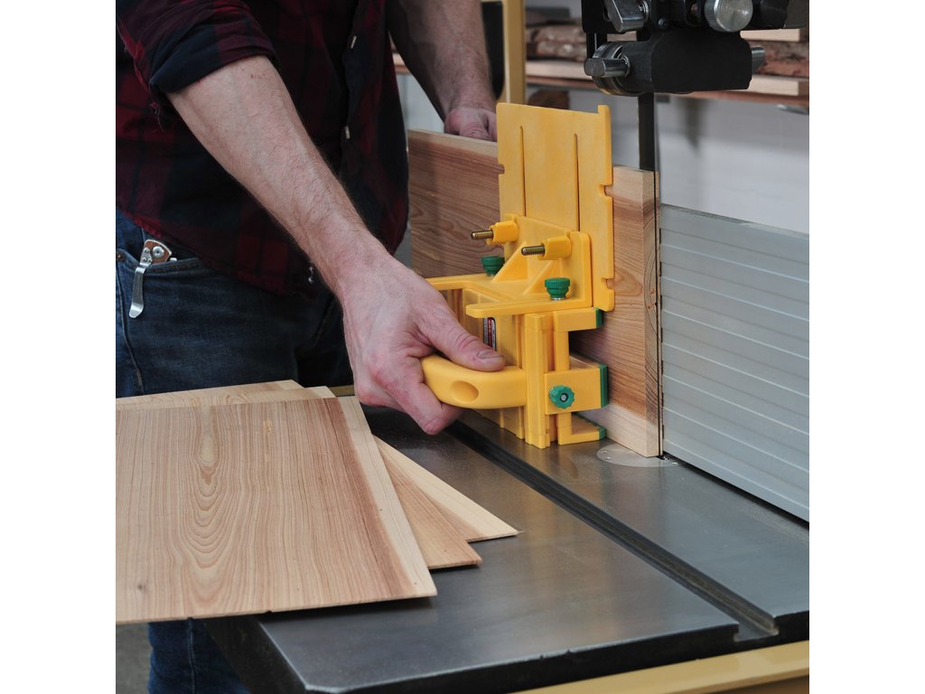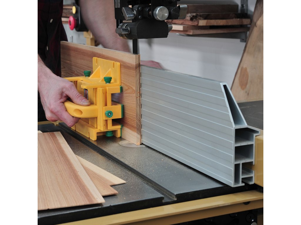 Baza și corpul GRR-RIPPER-ului mențin un unghi constant de 90 de grade. Cu toate acestea, dispozitivul poate fi folosit și pe lateral, ceea ce este ideal pentru tăierea pe ferăstraie cu bandă. GRR-RIPPER alunecă de-a lungul mesei și aplică o presiune uniformă asupra benzii ferăstrăului în timp ce ține mâinile departe de lama ferăstrăului. Chiar și presiunea înseamnă mai puțină mișcare a pânzei de ferăstrău, rezultând tăieturi mai fine.