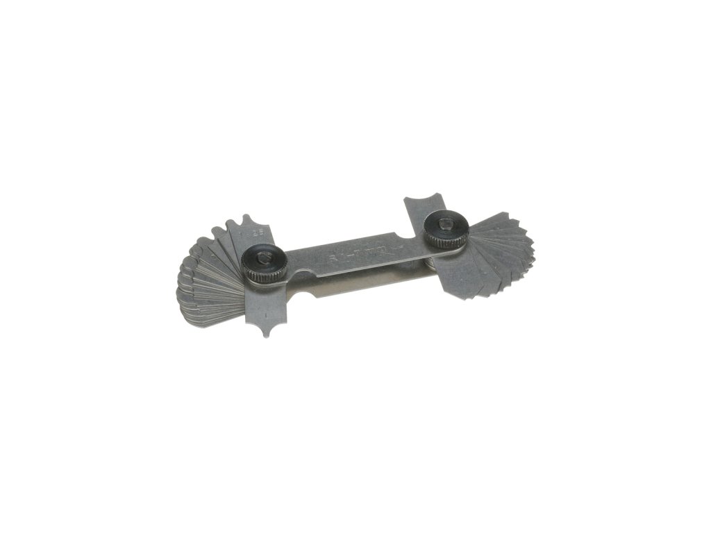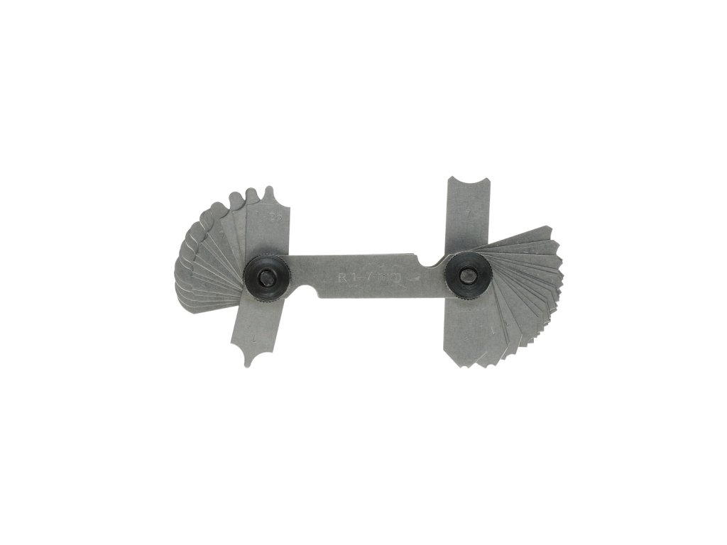 Set de 34 bucăți de instrumente de măsurare a razelor exterioare și interioare, în intervalul R 1 – 7 mm. Ambalat în blister.