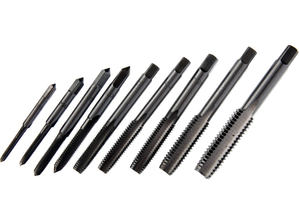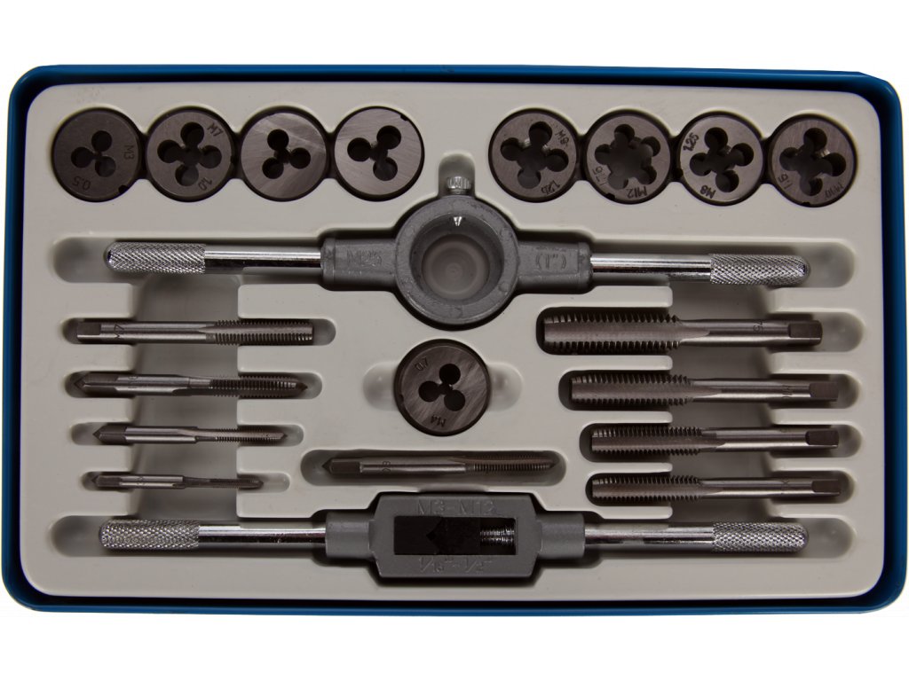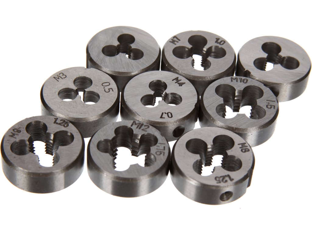 Set de 9 burghie de filetat, 9 matriţe de filetat şi filetierele corespunzătoare depozitate ordonat într-o casetă din plastic. Dimensiuni: M3 x 0,5, M4 x 0,7, M5 x 0,8, M6 x 1,0, M7 x 1,0, M8 x 1,25, M9 x 1,25, M10 x 1,5, M12 x 1,75, identice pentru ambele tipuri de scule.