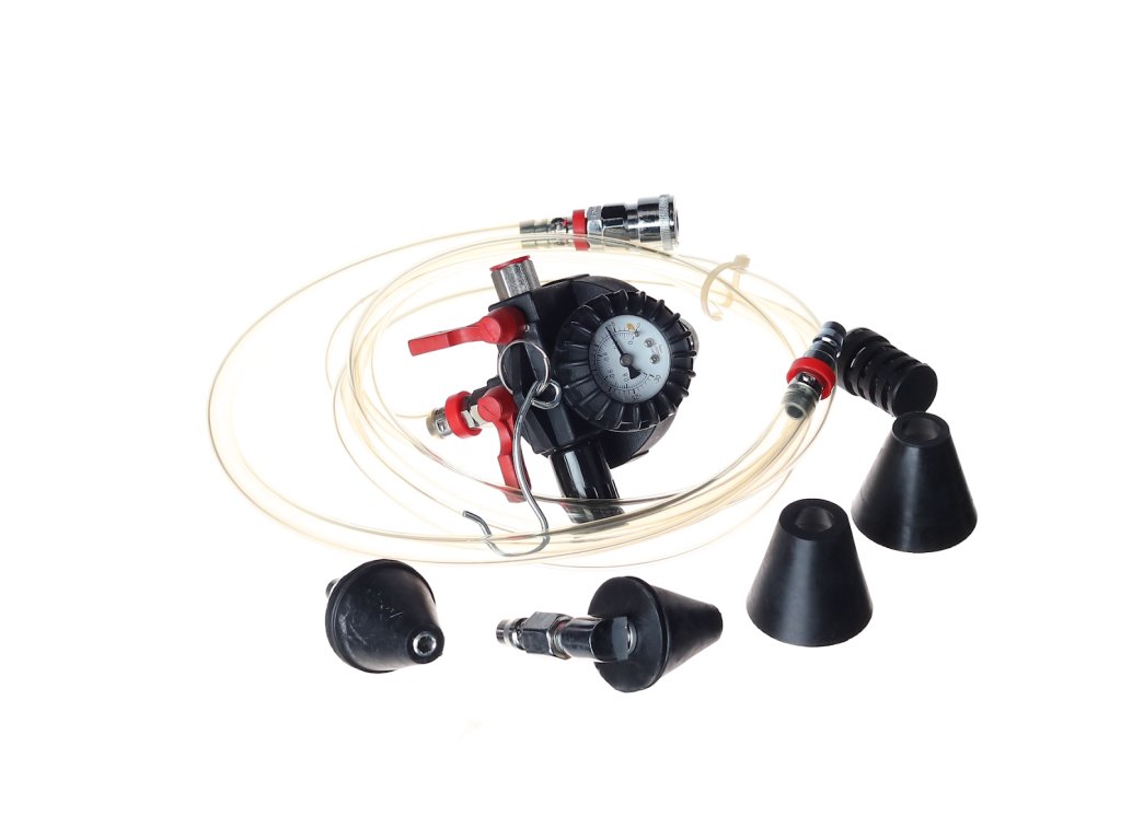 Un kit cu vid pentru realimentarea lichidului de răcire prin conectare la o sursă de aer comprimat. Poate fi utilizat şi pentru testarea etanşeităţii sistemelor de răcire. Kitul conţine un manometru, 4 adaptoare reducătoare din cauciuc şi un furtun de umplere. Ambalat într-o trusă din plastic.