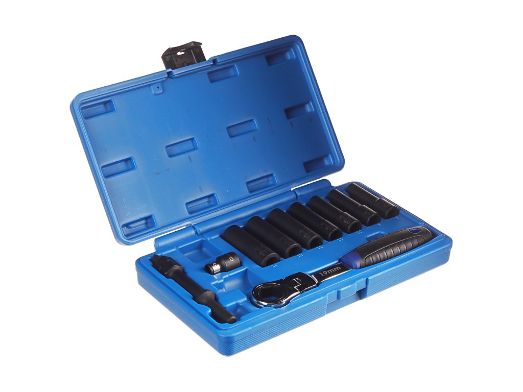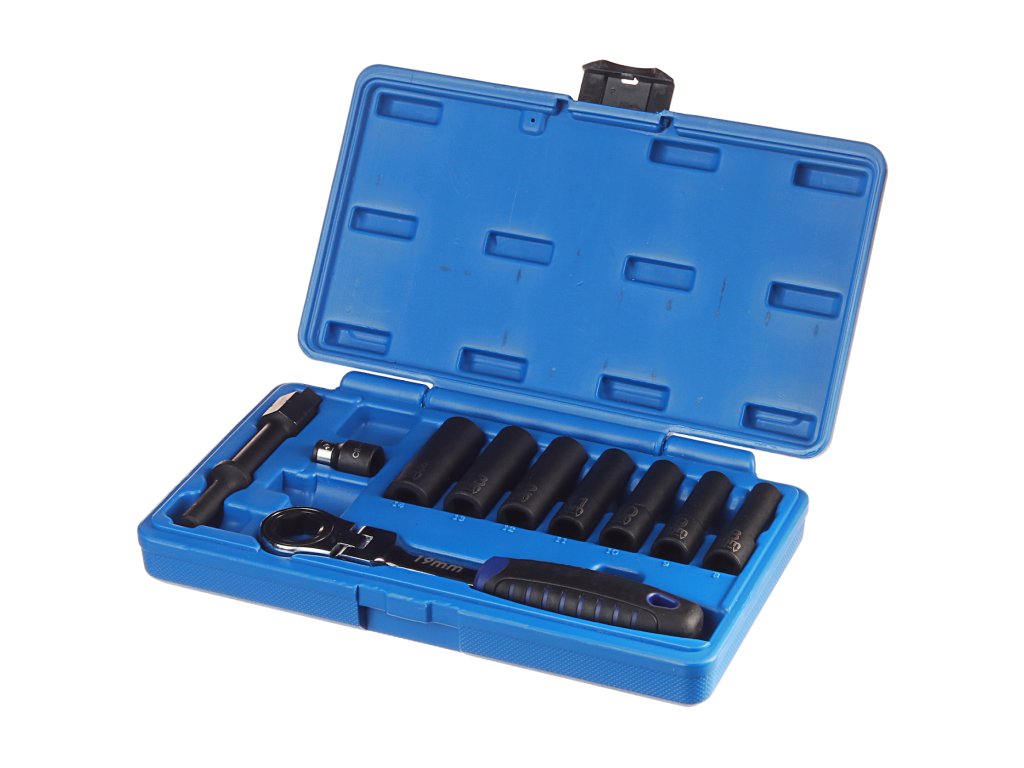 Set pentru slăbirea piuliţelor şi şuruburilor ruginite; nu permite ruperea acestora. Adecvat pentru sisteme de evacuare, bujii, injectoare, frâne etc. Setul de scule presupune utilizarea unei maşini cu impact pneumatic. Conţine un arbore cu impact de 3/8", un adaptor 3/8", un clichet bilateral articulat cu 72 de dinţi şi chei tubulare CR-V, cu dimensiunea de 8, 9, 10, 11, 12, 13 şi 14 mm. Ambalat într-o trusă din plastic.