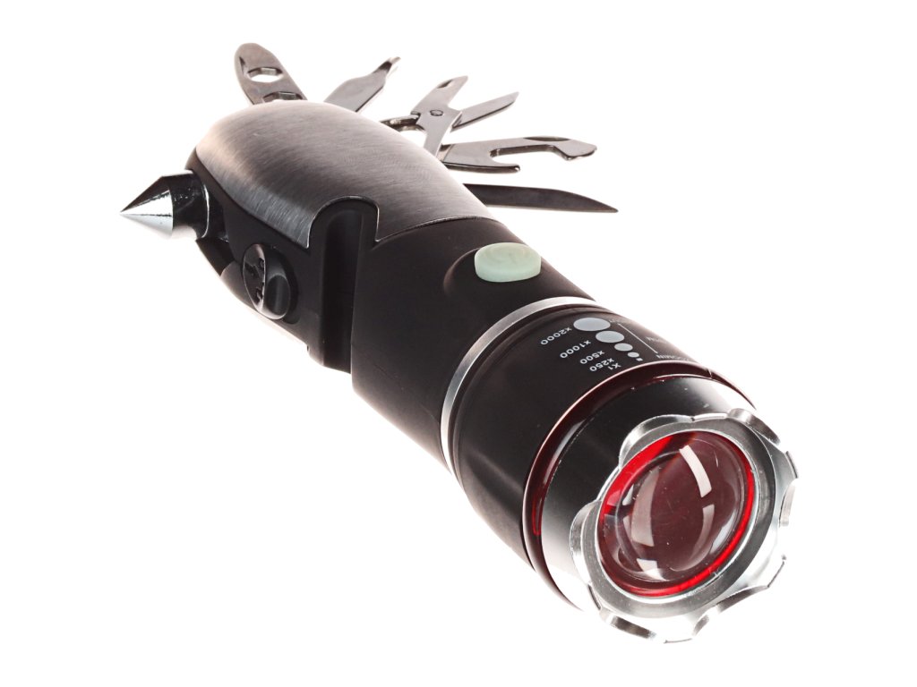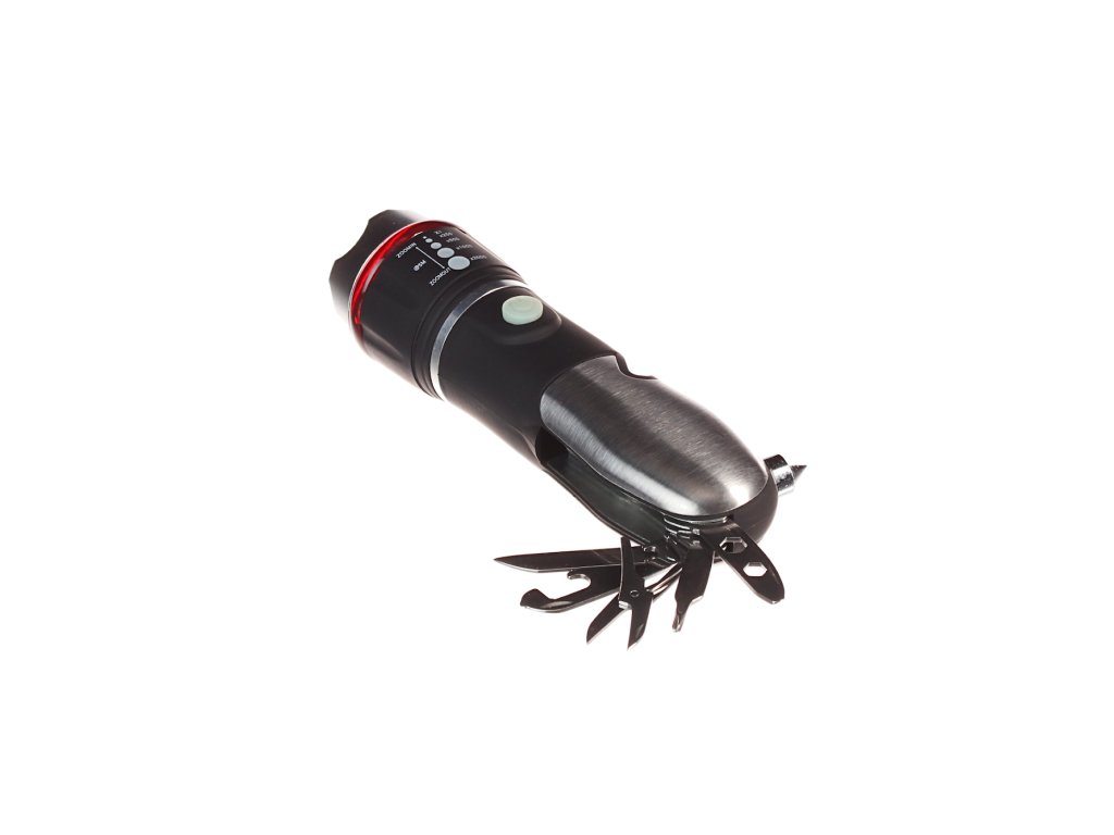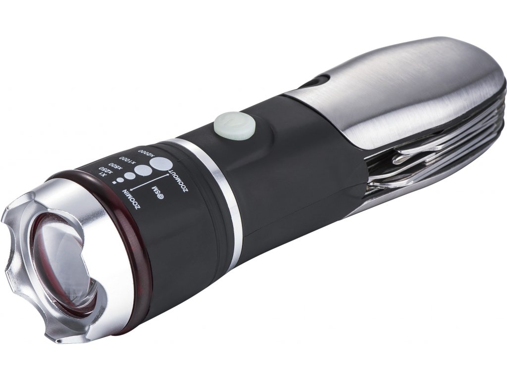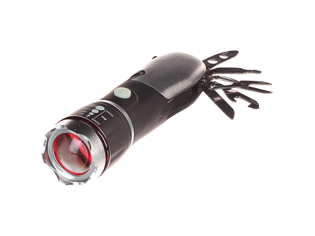 O lanternă multifuncţională cu un design din aluminiu şi trei moduri de iluminare: puternic, slab, intermitent. Prevăzut cu funcţie ZOOM şi un set de instrumente pliabile utile. Sursă de lumină: LED, flux luminos 120 lm. Alimentare electrică: 3 × baterii AAA, incintă IP44.