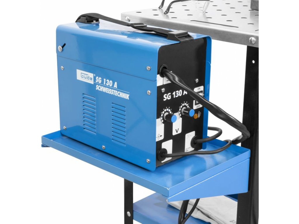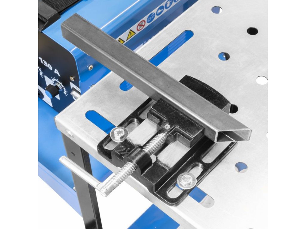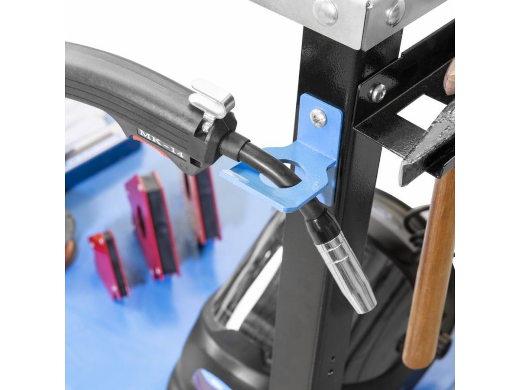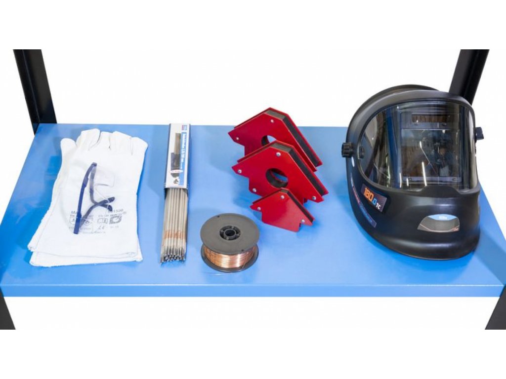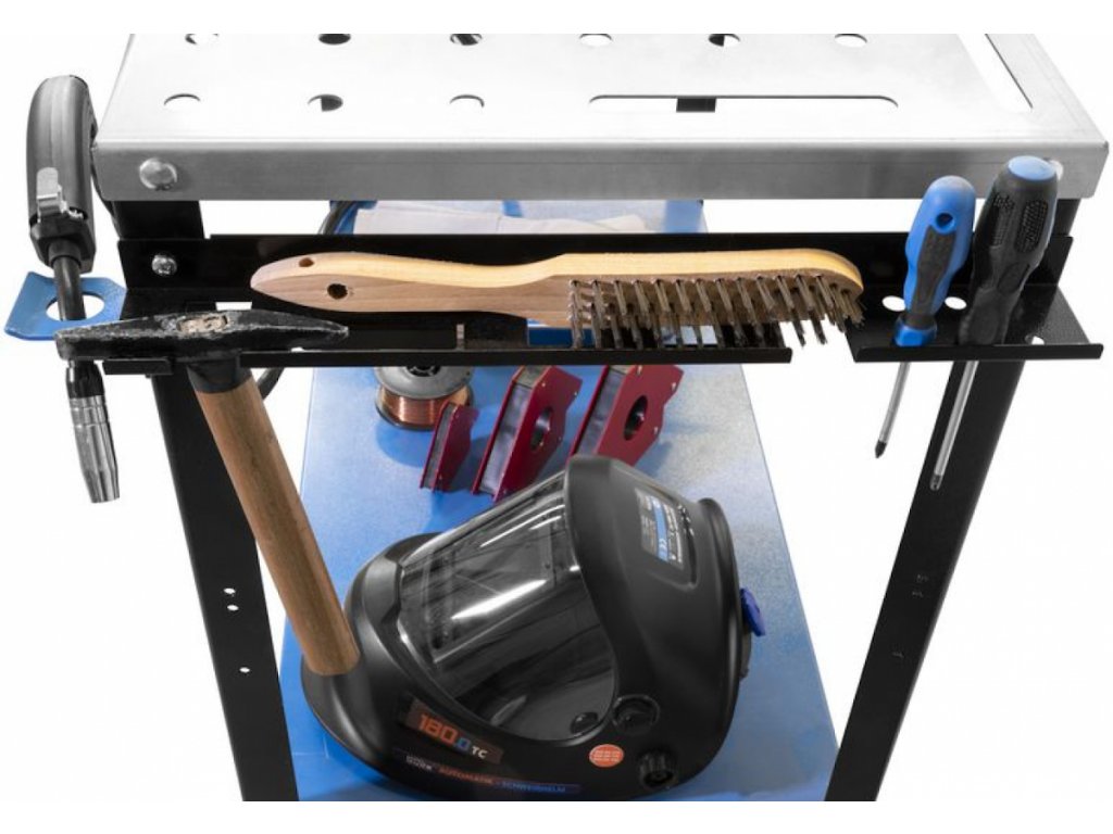 Masă de top cu găuri pentru a asigura sudarea cu jigs; paranteză la sursa de alimentare; rafturi de depozitare (2).