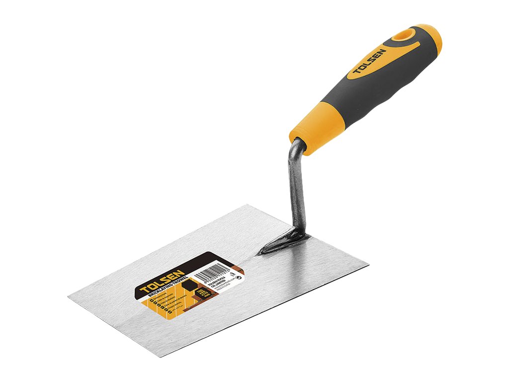 Mistrie de zidărie din oţel cu un mâner din plastic. Dimensiuni: 140 × 85 × 107 mm, diametrul cozii mânerului de 9,5 mm.