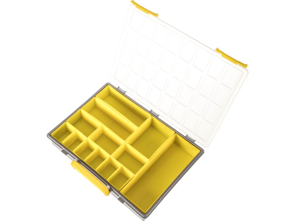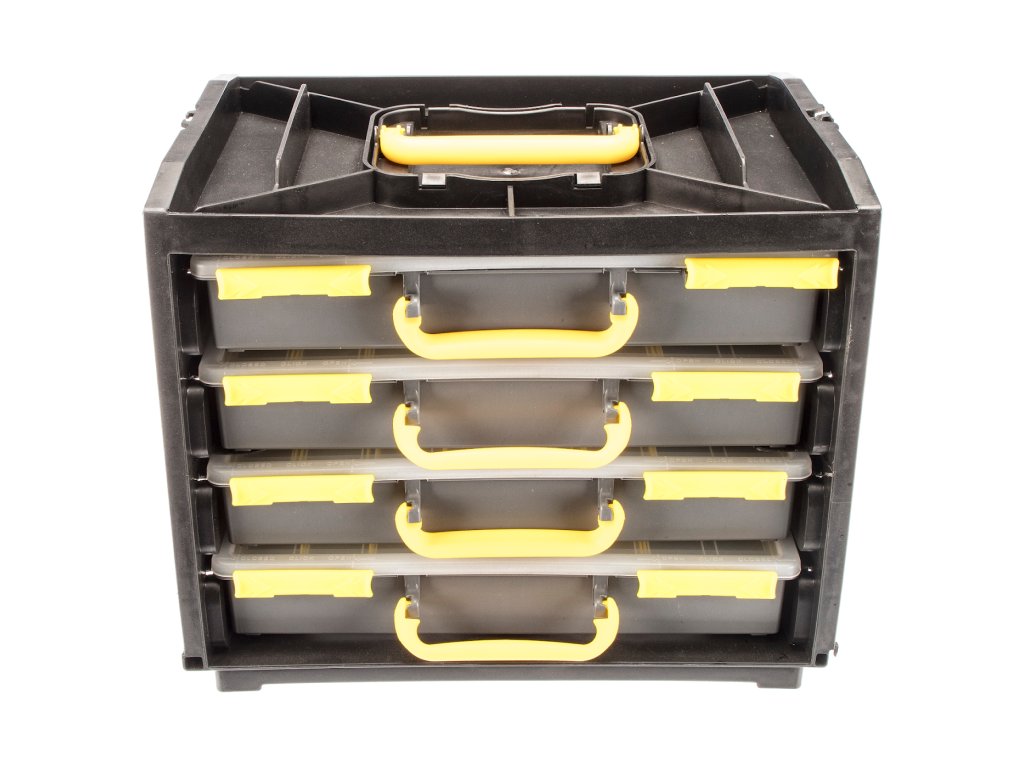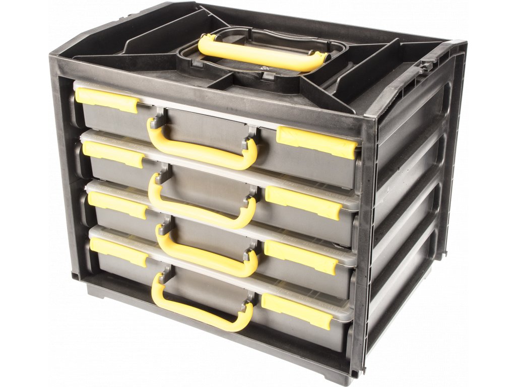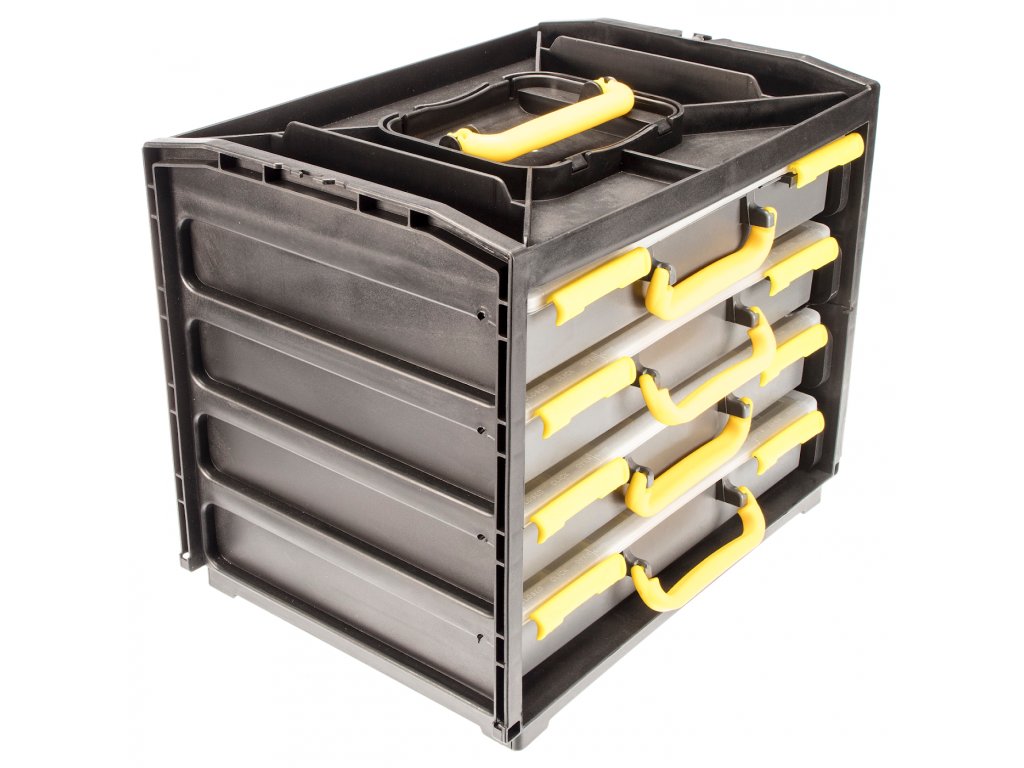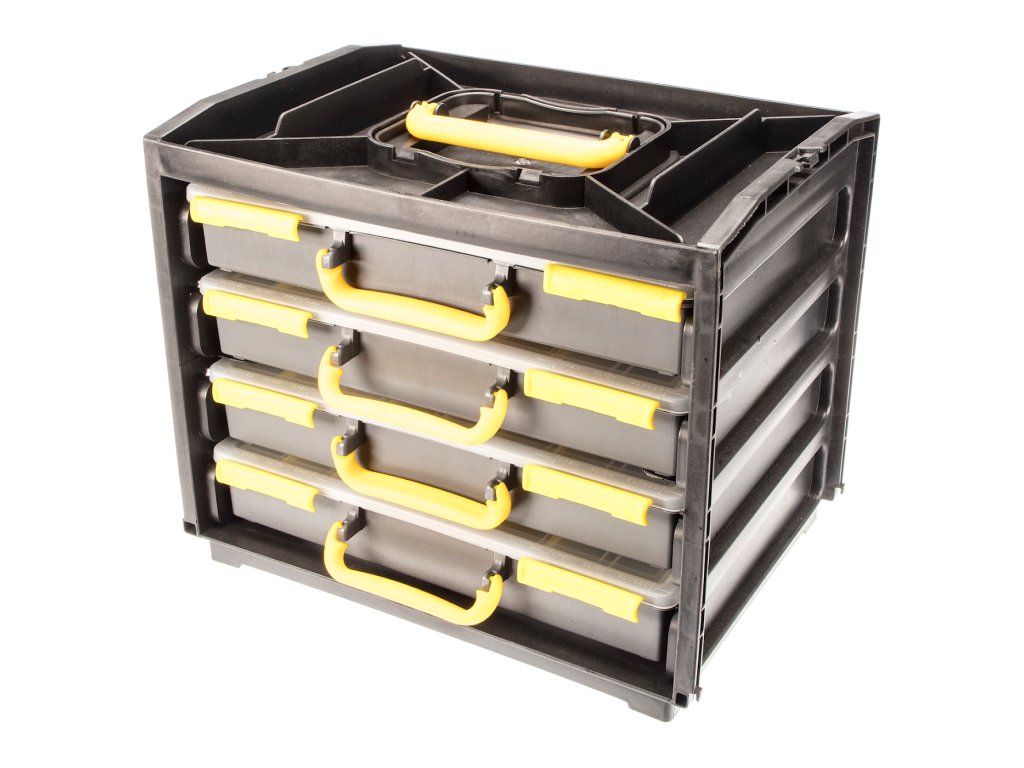 Cutie din plastic pentru piese mici, elemente de fixare şi scule mici. Echipat cu un mâner cu balamale încorporat, patru sertare culisante cu propriul lor capac transparent. Sertarele sunt împărţite în compartimente mai mici. Material PP, mărime sertar 340 × 250 × 60 mm, mărime totală 377 × 265 × 310 mm.