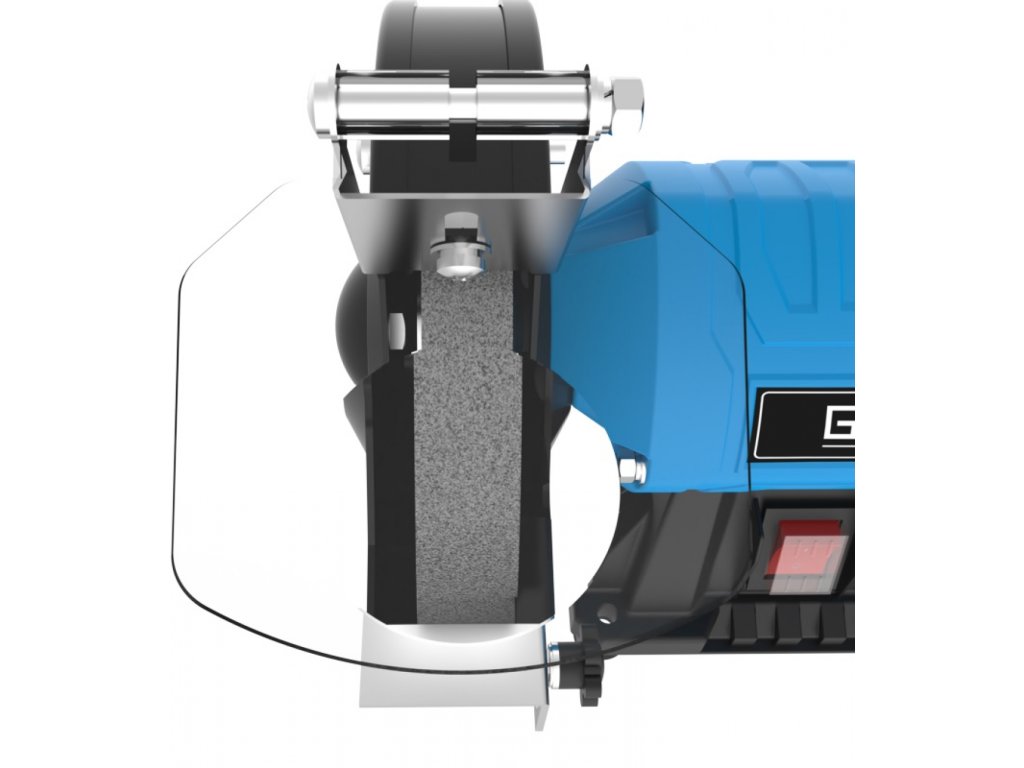 Construcție: carcasă metalică ușoară, suporturi reglabile pentru piese de prelucrat, protecții pentru scântei, piedestal robust (inclusiv găuri pentru montarea pe blatul de lucru).