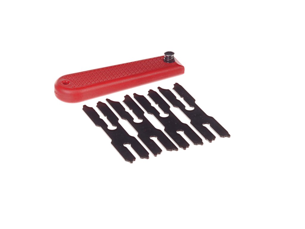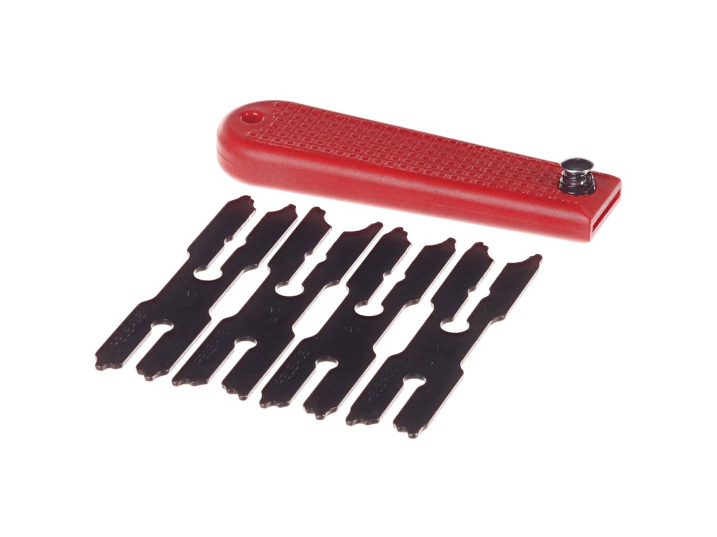 Utilizată pentru demontarea şi instalarea uşoară a inelelor E de la/pe arbori. Adecvată pentru diametre de 6, 7, 8 şi 9 mm, cu un mâner din plastic 1,220x35x15 cu un închizător pentru fixarea sculei.