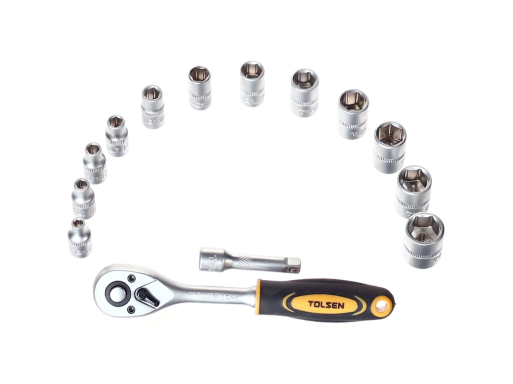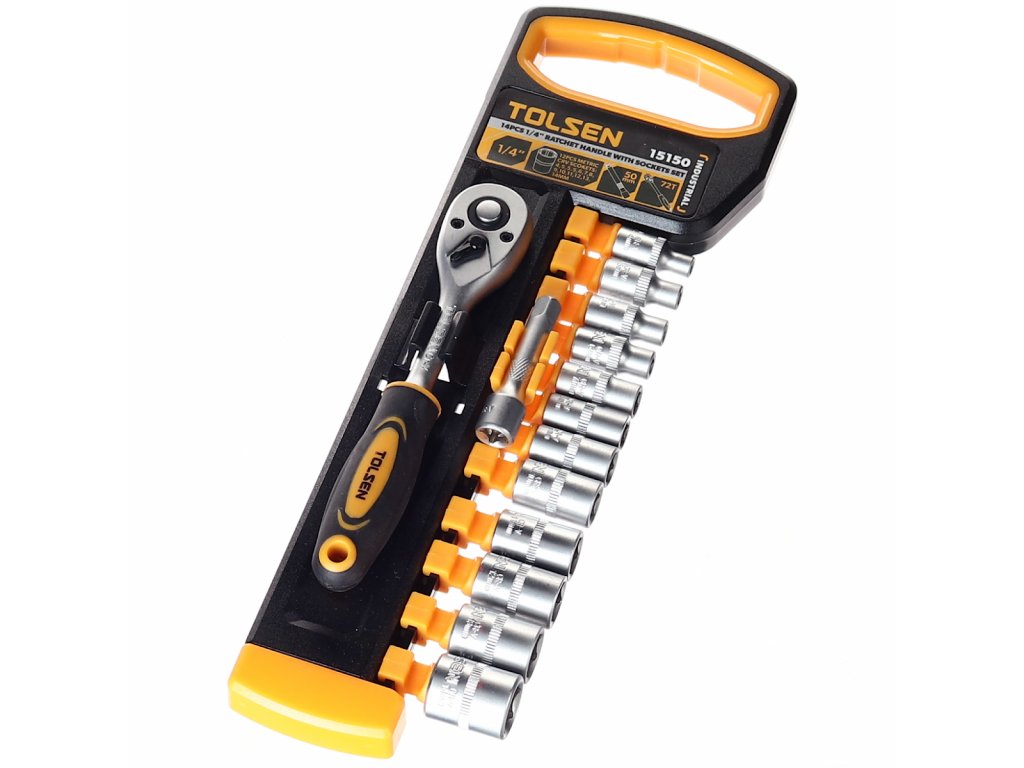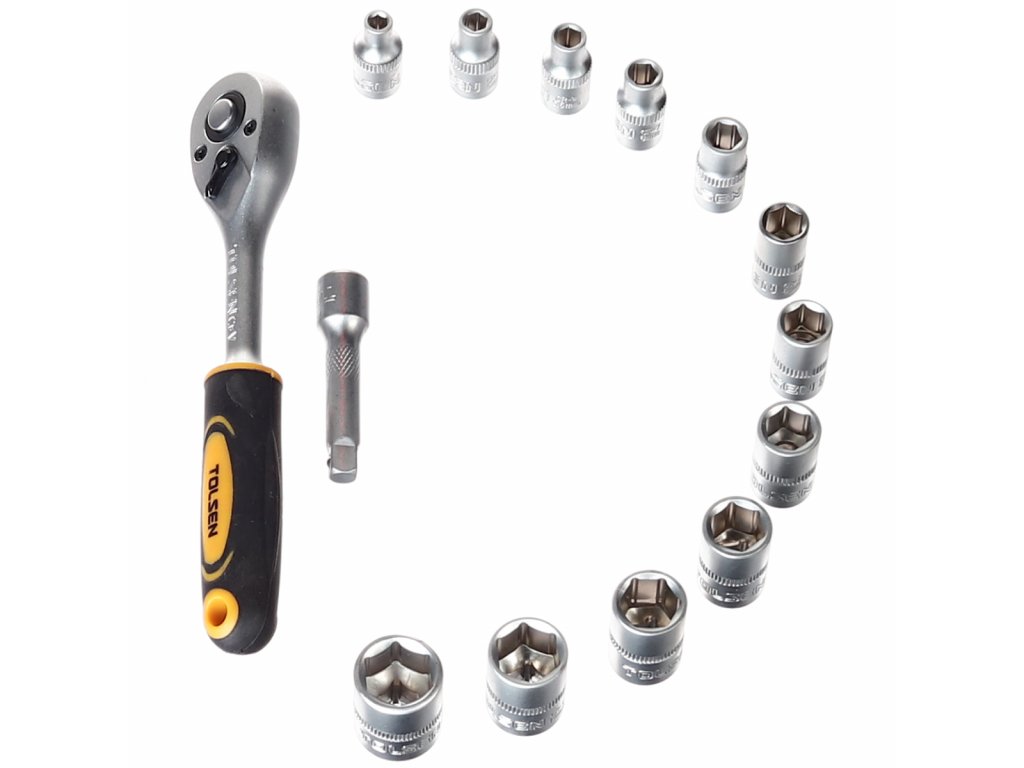 Conţine un clichet cu funcţionare stânga/dreapta, 72 dinţi, împreună cu un set de capete de cheie frontală: 4; 5; 5.5; 6; 7; 8; 9; 10; 11; 12; 13 şi 14 mm şi un prelungitor de 50 mm. Livrat cu un suport practic din plastic.