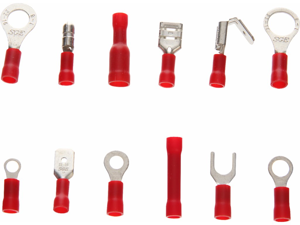 Set de 275 buc. piese de conectare cu izolație roșie pentru repararea cablurilor la autovehicule. Conține ochiuri de cabluri 6, 4, 2, 1/4", 5/16", conectoare, furci și racorduri ale cablurilor. Amplasare sinoptică în casetă din plastic.