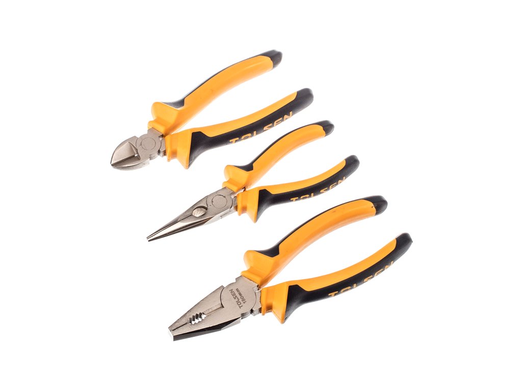 Set de cleşti din oţel nichelat cu mânere din plastic. Setul conţine: cleşte combinat de 180 mm; cleşte de tăiere sârmă în diagonală de 150 mm şi cleşte plat cu falcă lungă de 150 mm.