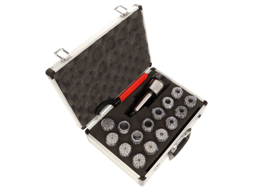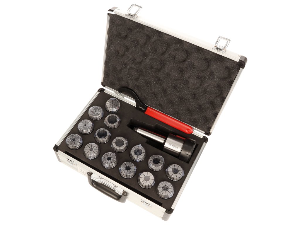strângere cheie și 15 buc de coliere diametru 3, 4, 5, 6, 8, 10, 12, 14, 15, 16, 18, 20, 22, 24 și 25 mm. Scurgere ax 0,005 mm; coliere 0,01 mm. Collet material oțel carbon 65Mn, cleme oțel aliat 40Cr. Furnizat îngrijit depozitat într-o carcasă metalică.
