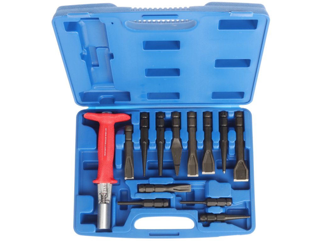 Mânerul este conceput ergonomic cu accent pe securitate. Înlocuirea uneltelor cu coadă hexagonală este simplă – eliberare cu ajutorul bolțului. Setul de vârfuri amovibile conține 5 buc. de dălți plate având lățimile de 13, 16, 19, 22 și 26 mm, 1 buc. daltă conică plată cu lățimea de 8 mm, 2 buc. de dornuri de 3 și 6 mm, 2 buc. de dornuri cilindrice de 5 și 6 mm și 2 buc. de punctatoare având diametrul de 3 și 5 mm. Materialul este oțelul CrV, toate uneltele sunt livrate cu amplasare sistematică într-o valiză de plastic.