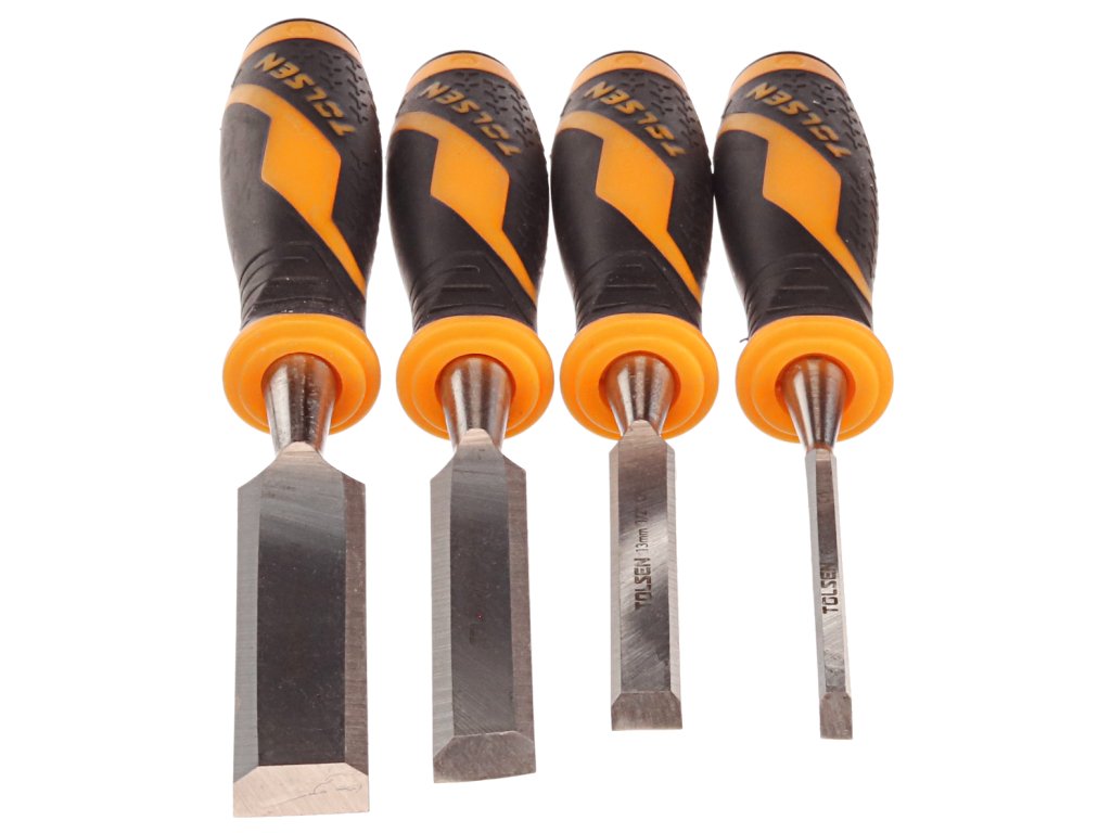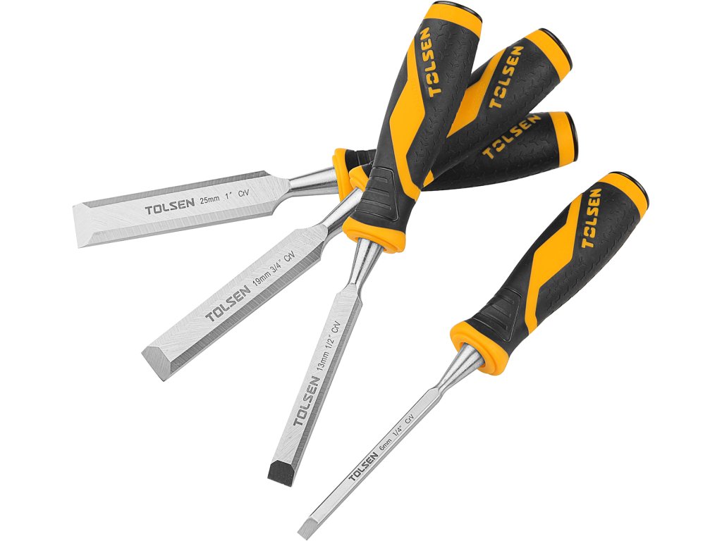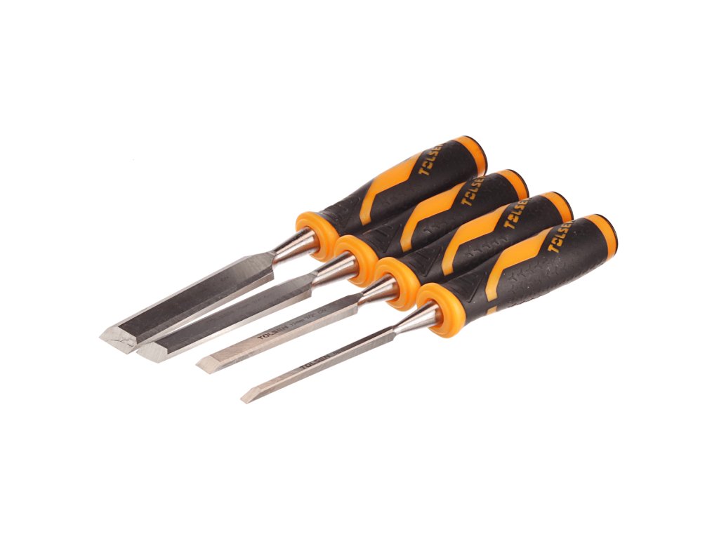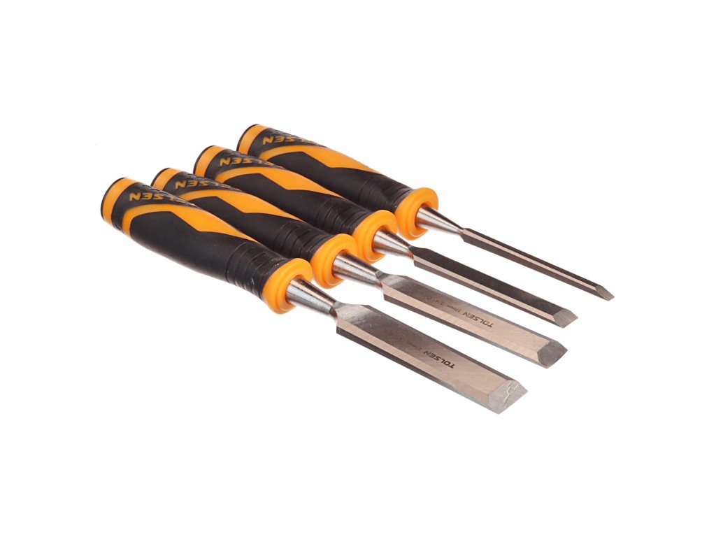 Set de dălţi de înaltă calitate din oţel Cr-V cu un mâner din plastic. Lăţime: 6; 13, 19 şi 25 mm. Ambalat într-un ambalaj cu blister.