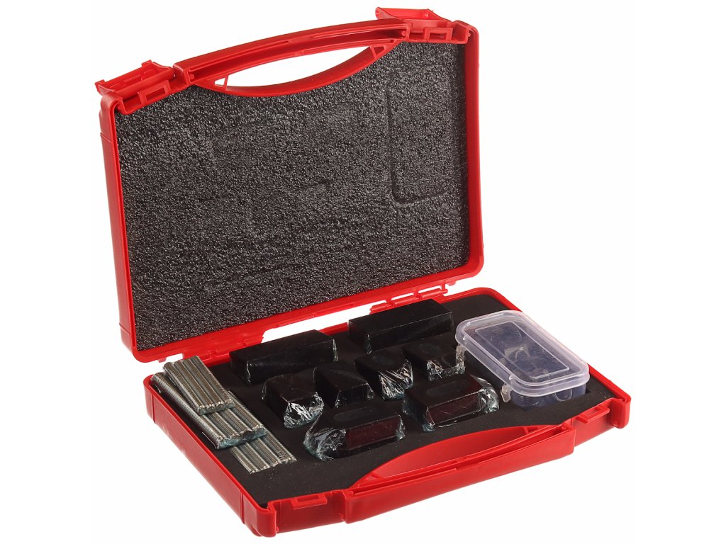 Conține 52 bucăți de elemente de fixare M6 și M8 din seria de bază, pentru fixarea rapidă a pieselor de prelucrat și elemente de fixare pentru fixarea normală pe echipamente de banc cu caneluri T. Blocuri gradate, cleme gradate, piulițe M6 și M8 cu flanșă, T piulițe M6 ș M8, bolțuri M8 × 85 mm și bolțuri M6 × 56 mm. Păstrate în cutie din lemn.