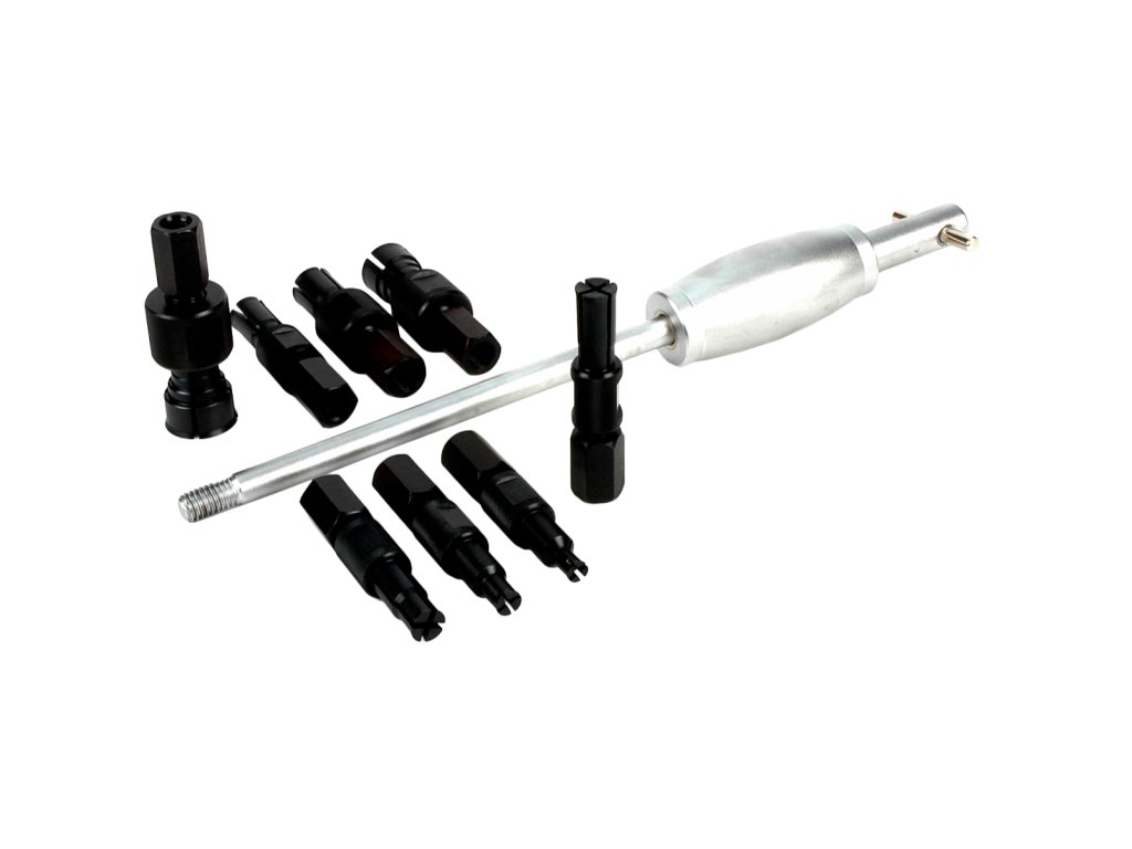 Extractorul de rulmenţi este indispensabil la demontarea rulmenţilor cu plasare în interior, fără accesul din ambele părţi. Dornul de extindere cu bucşă sprijină cu fiabilitate şi grijă rulmentul iar cu ciocanul revers îl scoateţi uşor. Greutatea ciocanului 1 kg, diametrele dornurilor de extindere: 8, 10, 12, 15, 17, 20, 25, 30 mm.