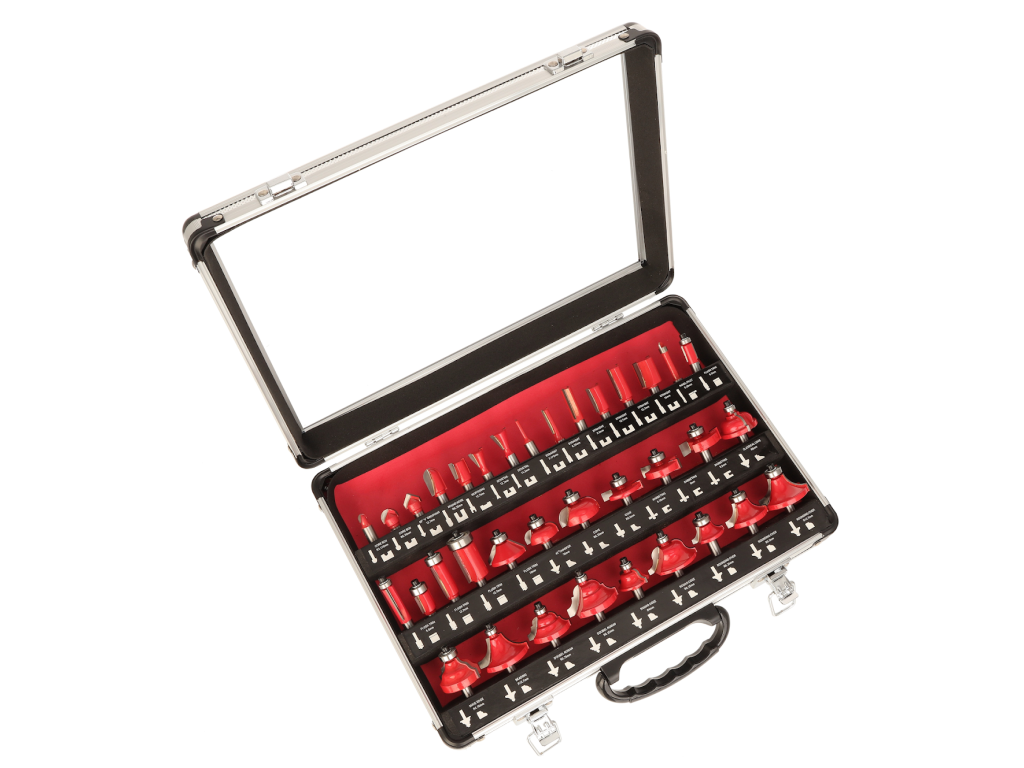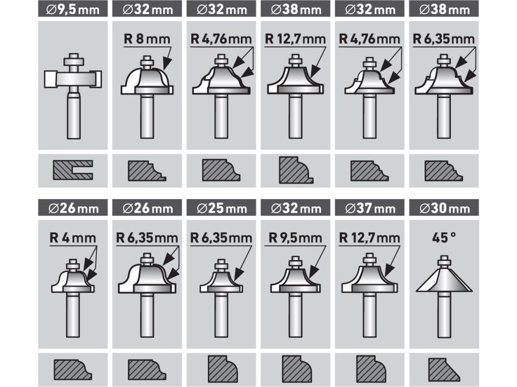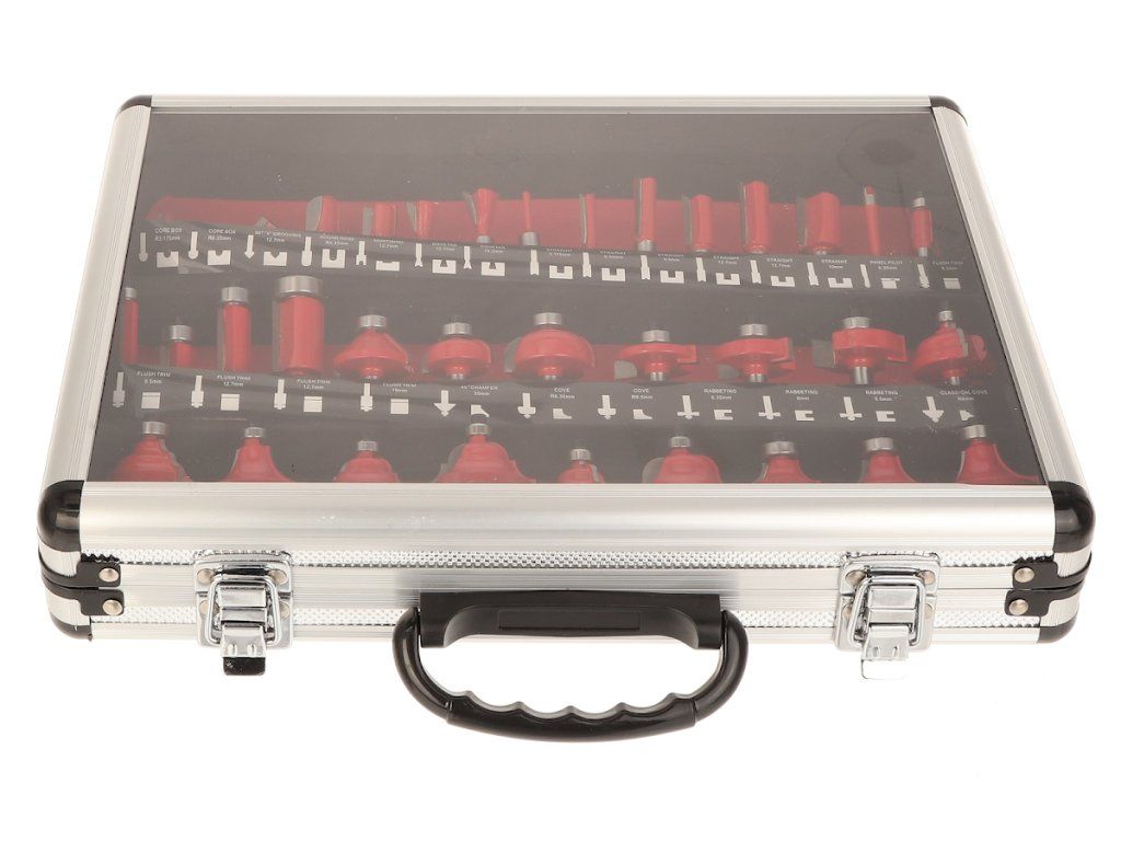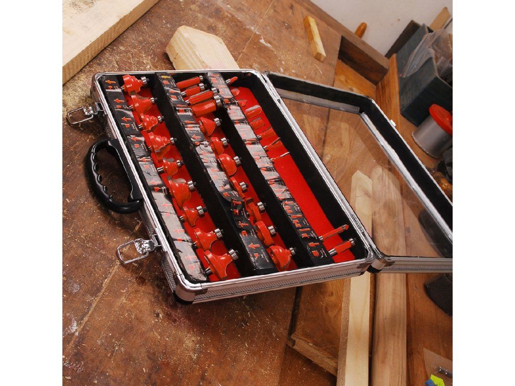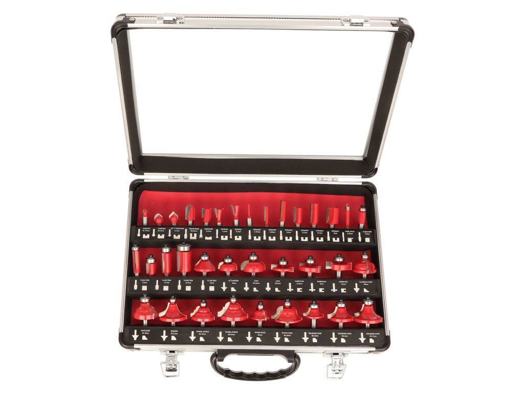 Set mare de freze de profil cu o coadă, cu diametrul de 8 mm. Frezele au o margine de tăiere cu carbură de tungsten şi sunt echipate cu o roată de ghidare cu un rulment de înaltă calitate. Potrivite pentru prelucrarea şi tăierea lemnului moale şi tare, a plăcilor din plastic şi a plăcilor presate. Livrate perfect depozitate într-o cutie metalică.
