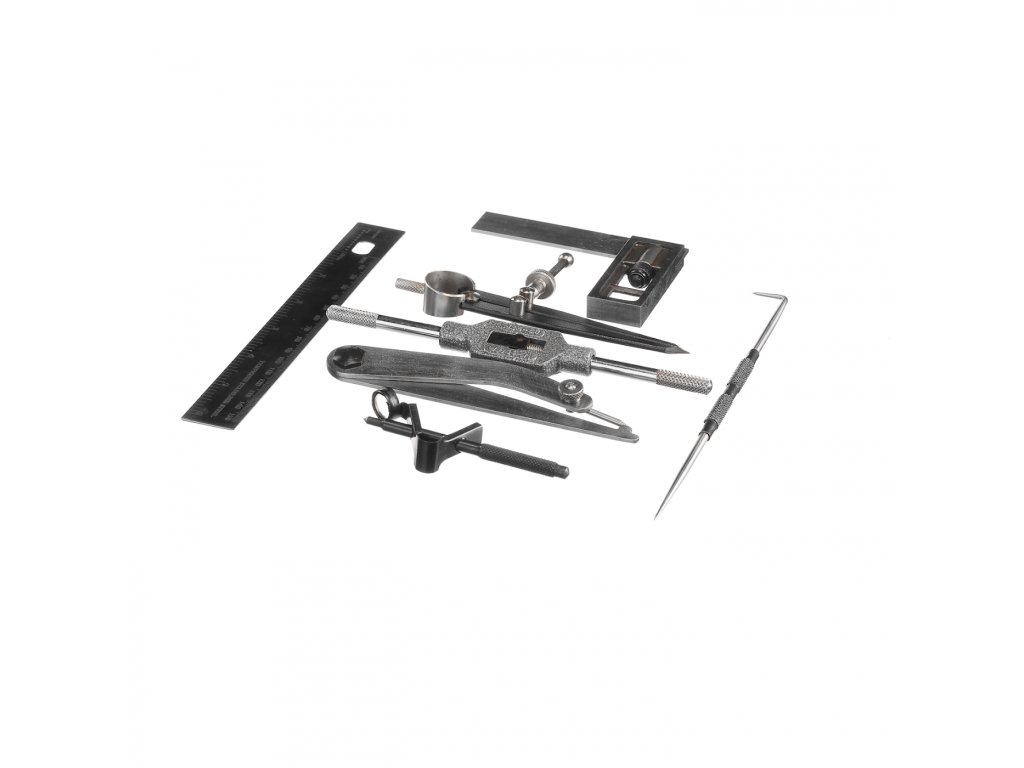 Setul conține: vinclu reglabil 100 mm, cabestan, etrier metalic 150 mm, trasor cu două capete, trasor, compas, punctator cu lupă. Ambalate într-o carcasă din plastic, de suspendare.