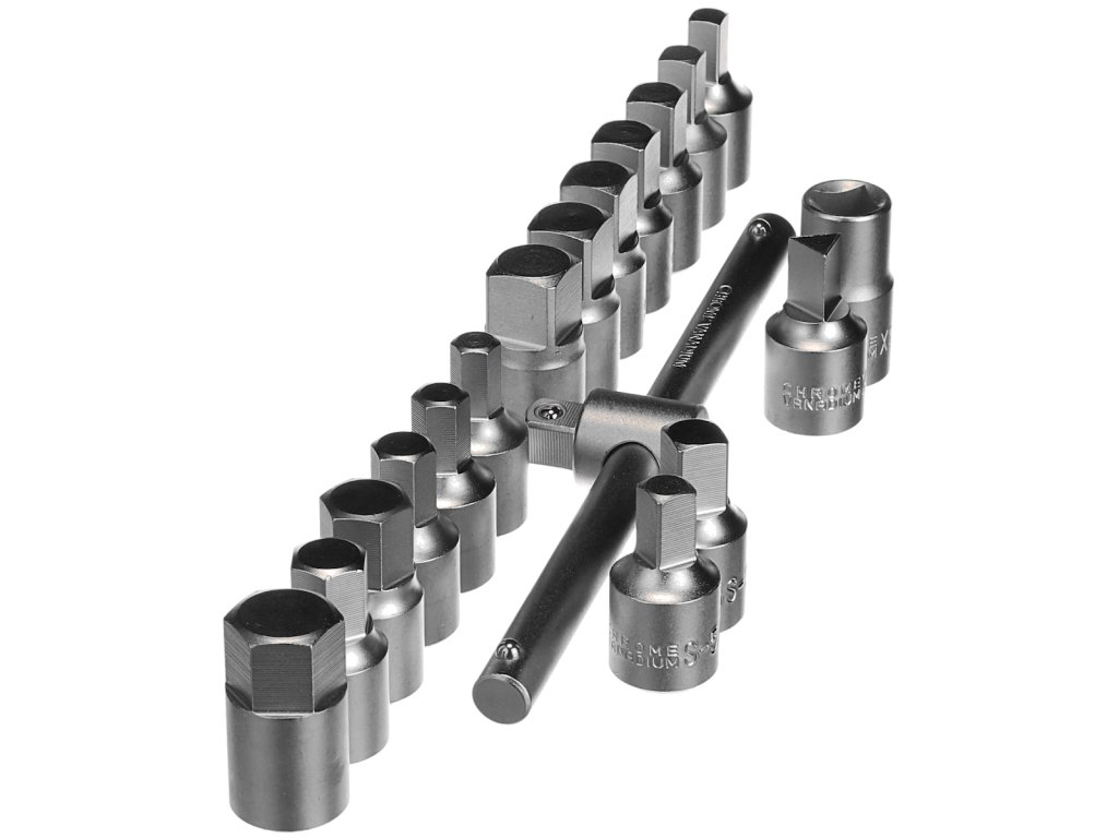 Setul de piese pentru buşoanele băii de ulei conţine 18 piese pentru toate tipurile de buşoane utilizate. Chei hexagonale 8; 9; 10; 12; 14 şi 17 mm, pătrate 7; 8; 10; 11; 12; 13; 14 mm; 5/16" şi 3/8", priză 10 mm, bară culisantă în T triunghiulară 10 mm şi 3/8. Livrat într-o trusă din plastic.