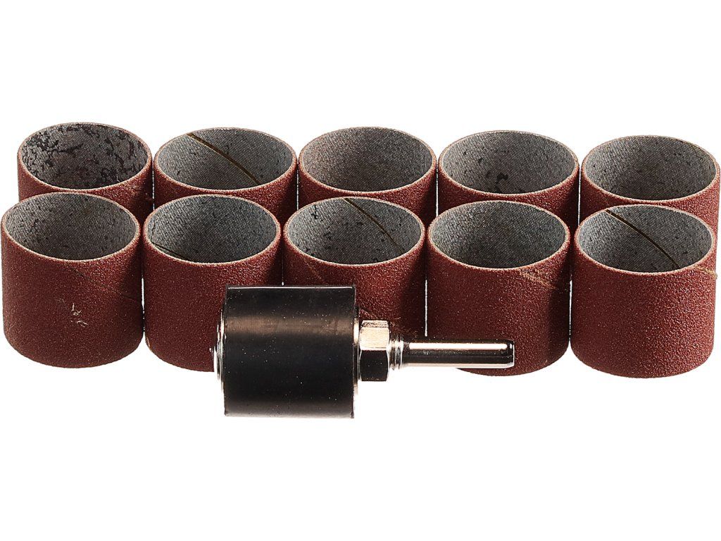 Setul conţine 10 role cu un diametru de 25 mm şi un suport din cauciuc pe o coadă. Adecvat în special pentru şlefuirea lemnului profilat.