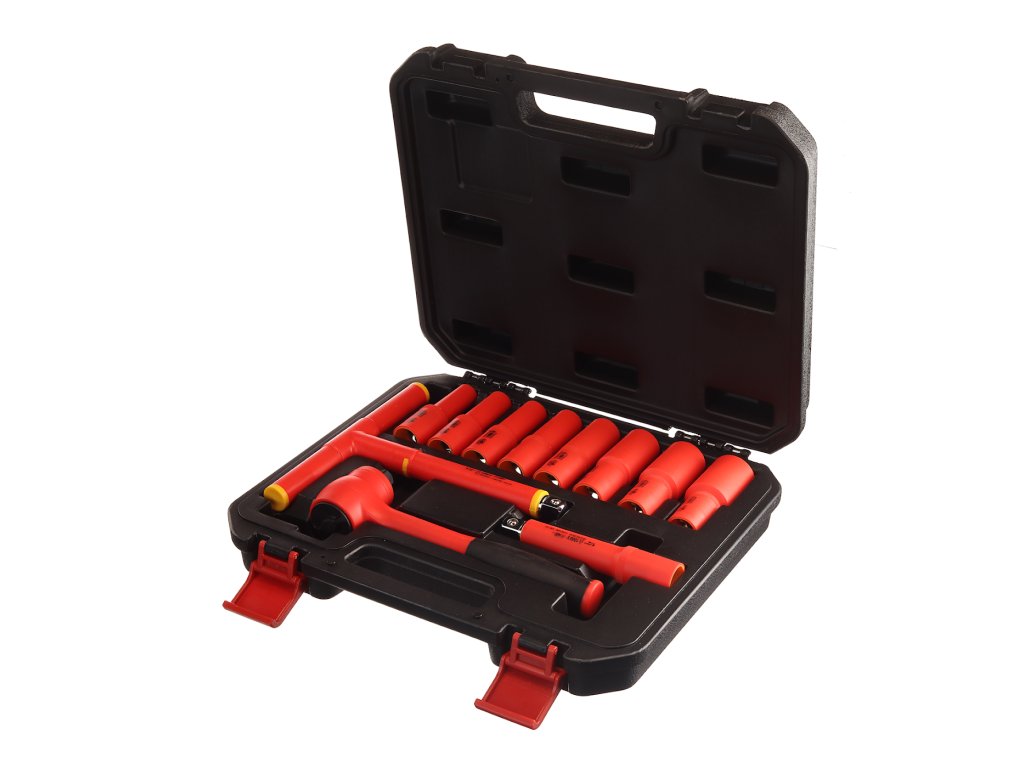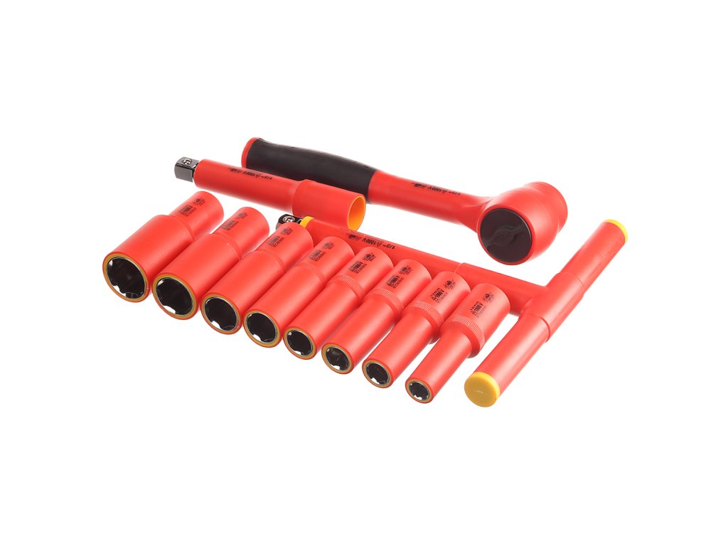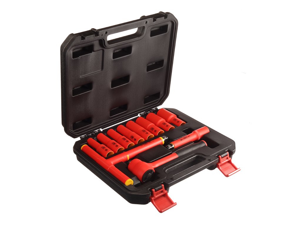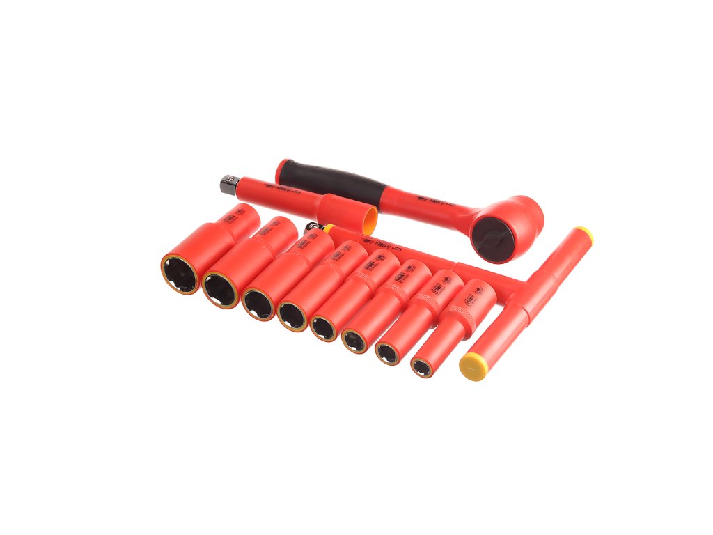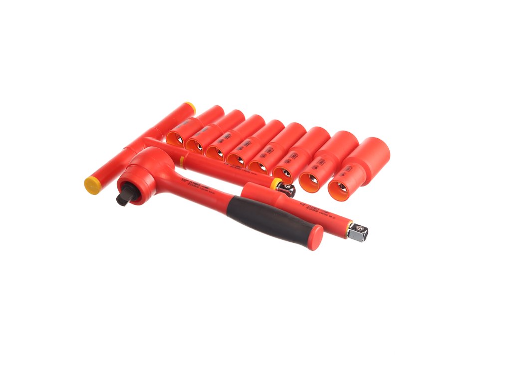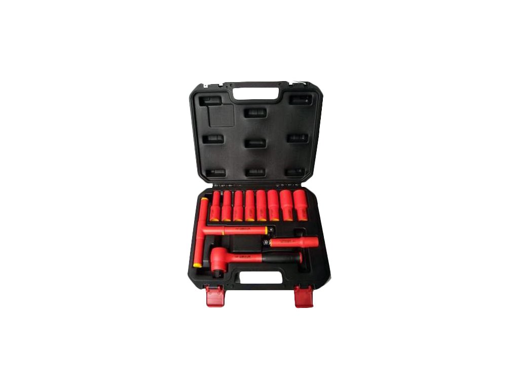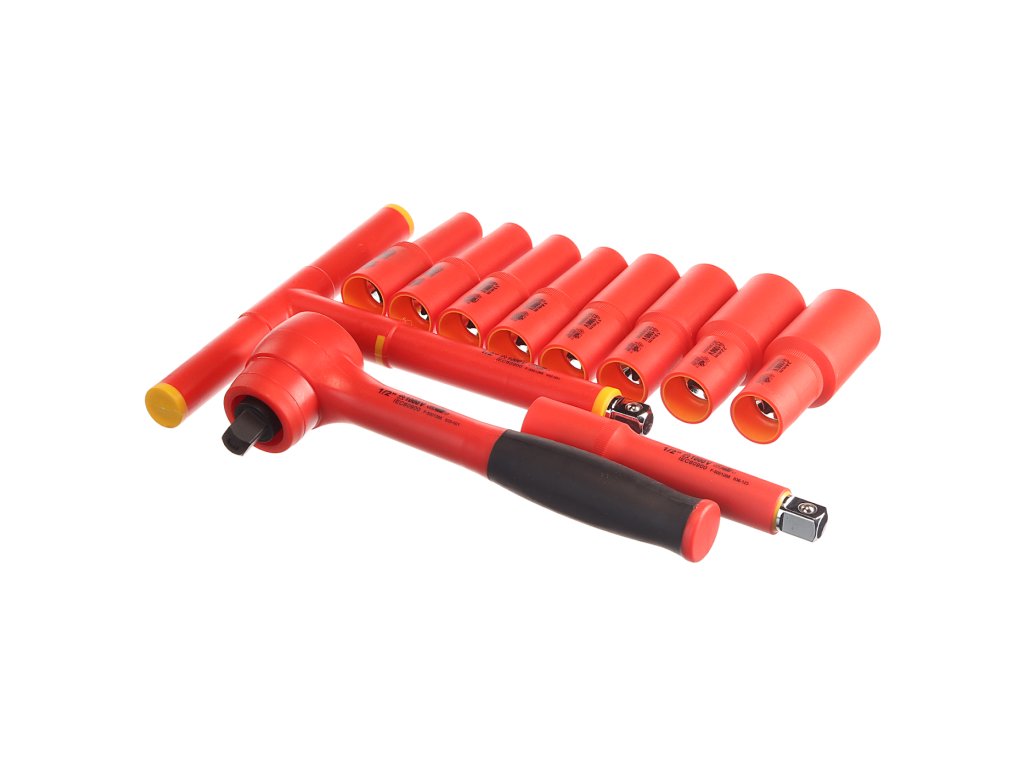 Setul de scule izolate include un clichet de 1/2" cu adaptoare de dimensiunile 10, 12, 13, 14, 17, 19, 22 şi 24 mm, adaptor de extensie de 125 mm şi cheie T. Livrat într-o trusă din plastic.