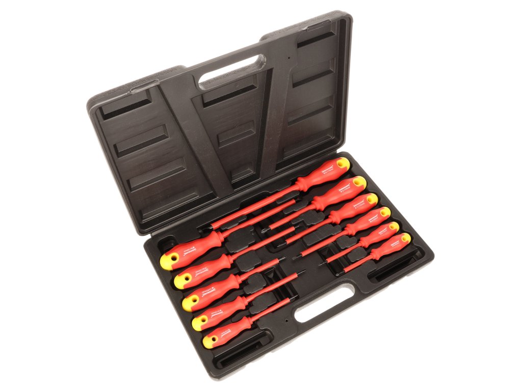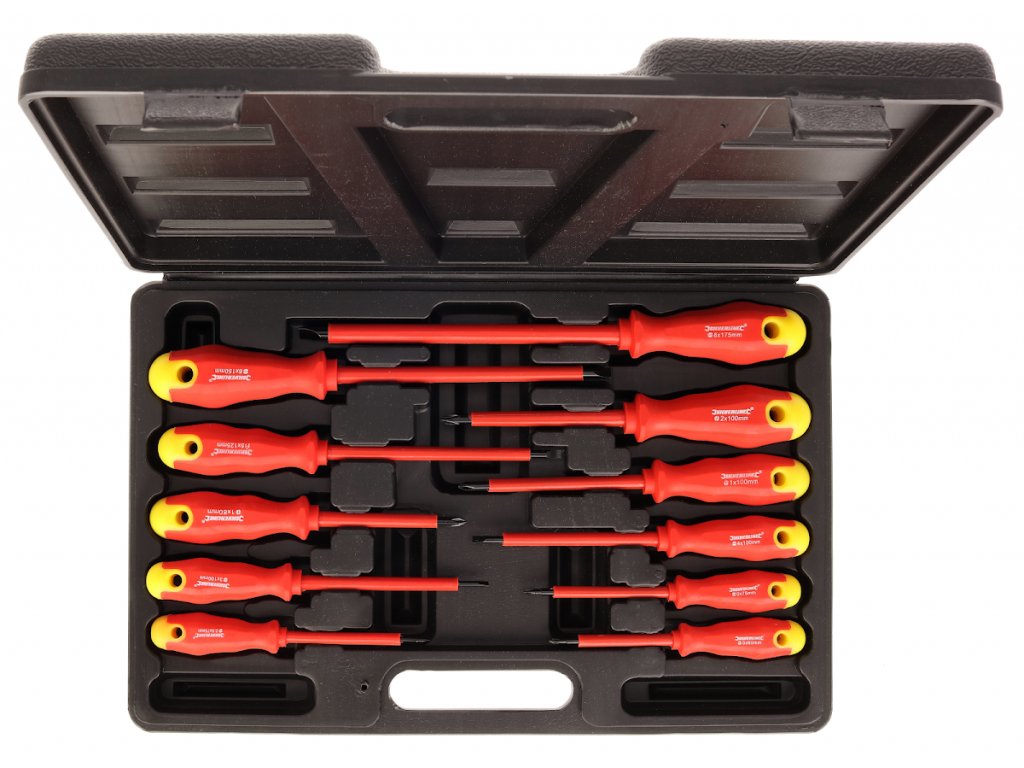 Vanadiu de crom întărit și șanțuri izolate cu vârfuri magnetice înnegrite chimic de duritate HRC50-55, mânere ergonomice cu profil hexagonal. Ideal pentru curent electric scăzut și lucrări auto. Pachetul conține plat: 2,5 × 75 mm; 3 × 100 mm; 4 × 100 mm; 5 × 125 mm; 6 × 150 mm, 8 × 175 mm; cruce PH0 × 60; PH0 × 75; PH1 × 80; PH1 × 100 și PH2 × șurubelnițe de 100 mm. Furnizat într-o carcasă din plastic.