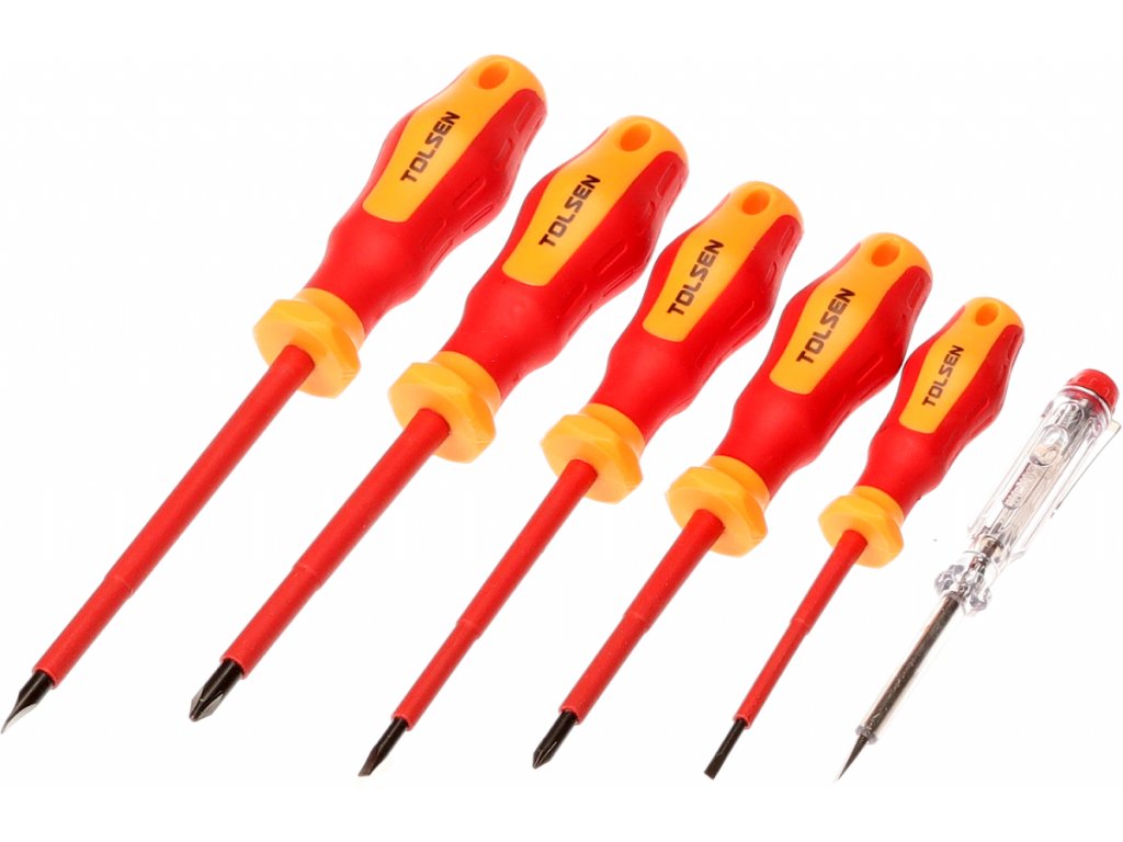 Setul conţine: şurubelniţe cu cap plat 3 × 75; 4 × 100; 5,5 × 100 mm. Şurubelniţe cu capul în cruce PH1 × 80 şi PH2 × 100 mm şi tester de tensiune 3 × 140 mm.