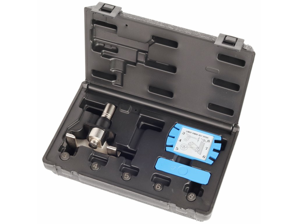 Permite reglarea uşoară, dar eficientă şi precisă a întinderii curelei de distribuţie pe baza grosimii curelei. Potrivit pentru toate tipurile comune de curele de distribuţie cu o lăţime de până la 30 mm. Setul conţine o unealtă de măsurare a curelei, tensiometru, împingătoare întinzătoare şi bandă de calibrare. Se livrează într-o cutie de depozitare.