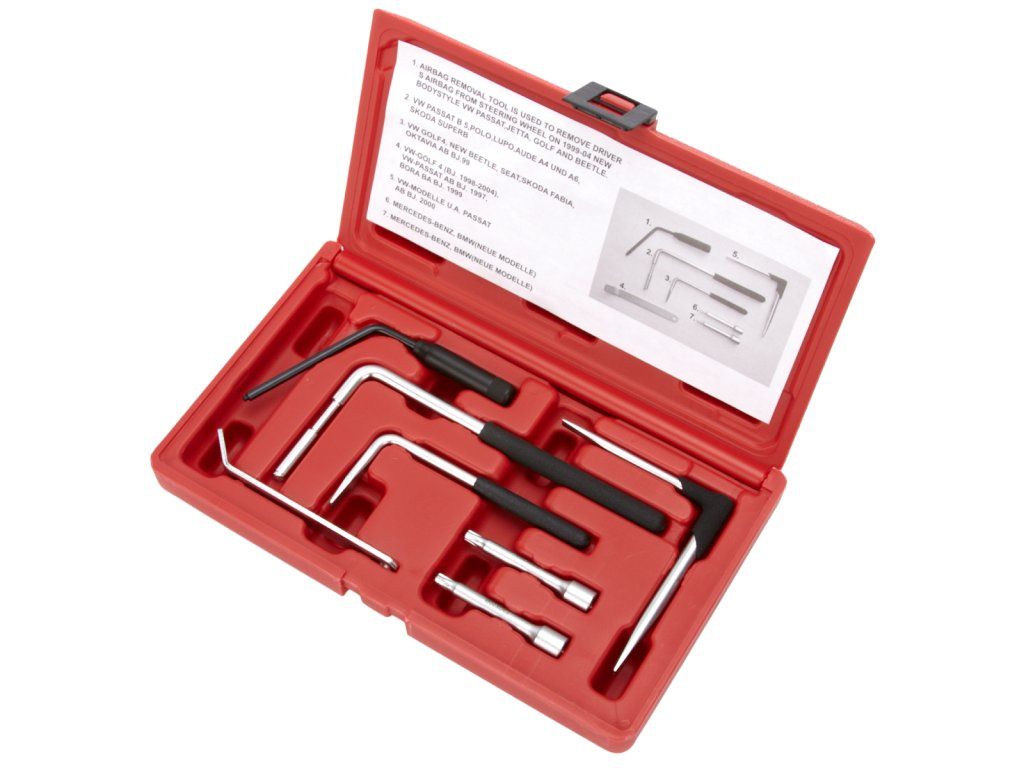 Set de 7 buc. scule pentru demontarea airbagurilor de pe volanele maşinilor marca VW Passat 1999 – 2004, Jetta, Golf, Beetle, Polo, Bora, Seat, Skoda Fabia, Octavia, Superb, Audi A4 a A6, Mercedes Benz, Ford, Opel, BMW. Ambalare în casetă de plastic.