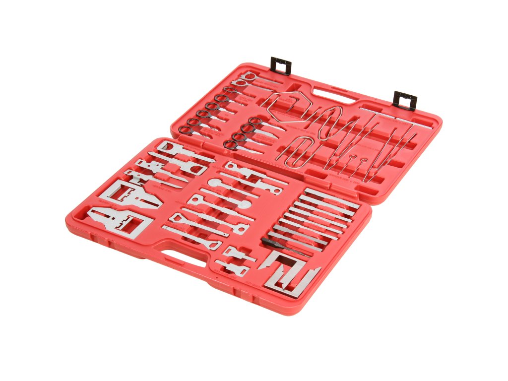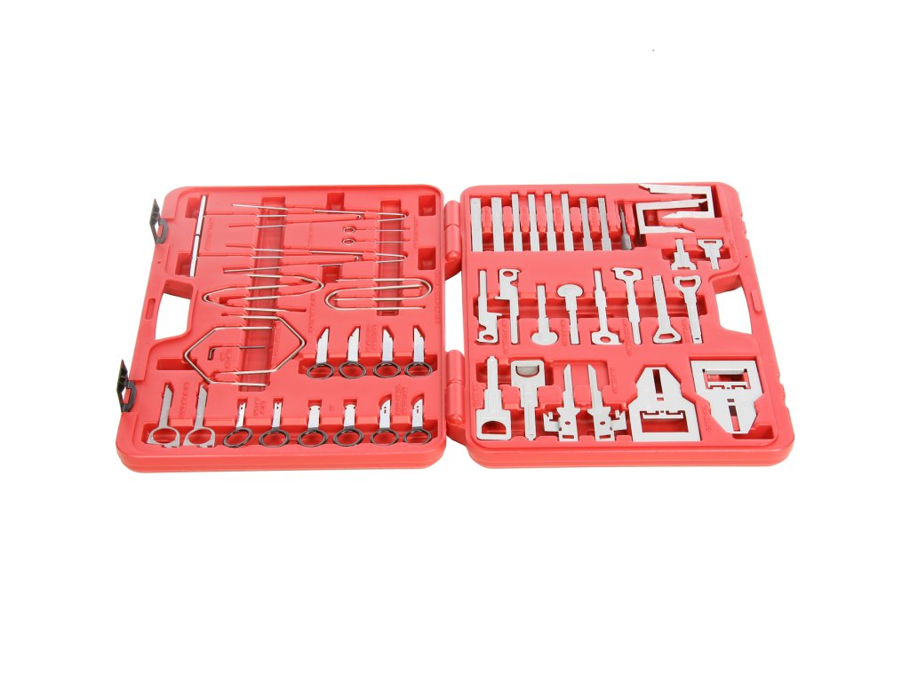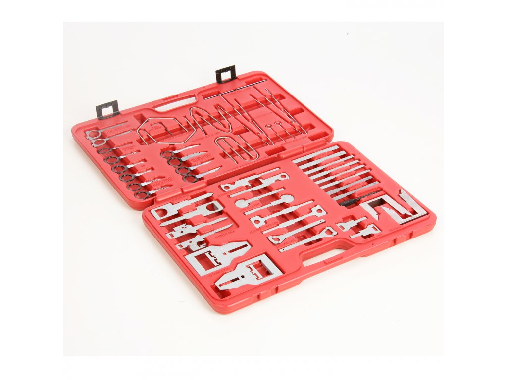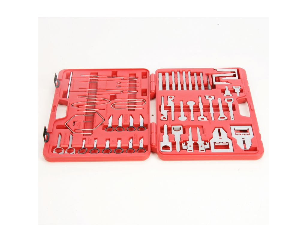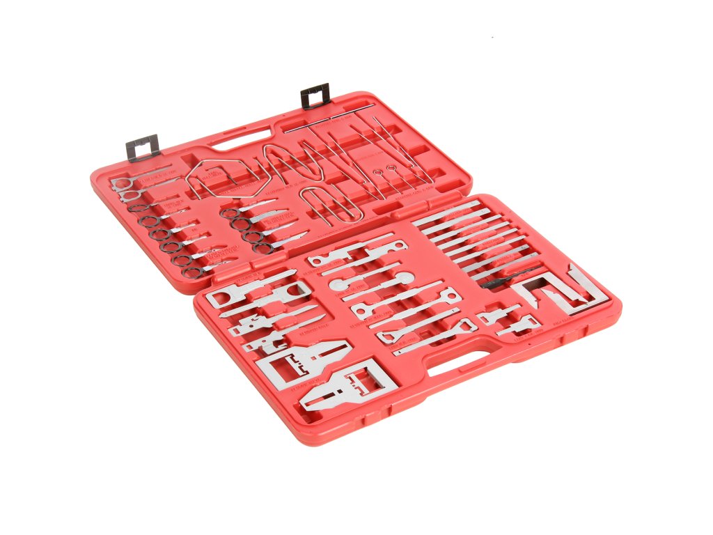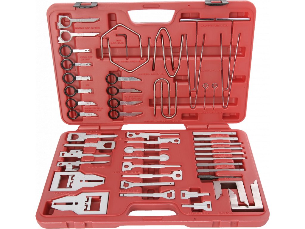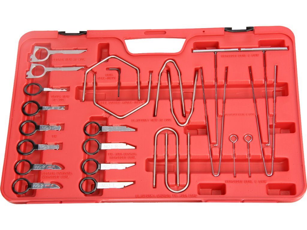 Set nou cu completare bogată de 52 buc. de chei, cârlige și alte ustensile pentru demontarea radiourilor auto a majorității mărcilor vândute. Utilizarea dispozitivului împiedică deteriorarea radioului și a bordului și ușurează demontarea. Un rezumat scurt al mărcilor cuprinse: KENWOOD 1998-2001, SONY II 2002, KENWOOD III 2002, PIONEER + JVC, SONY I 2001, PANASONIC, KENWOOD I 1998, KENWOOD MASK, CLARION (NEW), CLARION (ALT), FIAT BRAVA, OPEL Dopel-Kugel-Inbus, BLAUPUNKT, GRUNDIG, VW/AUDI/BECKER/MERCEDES BENZ, PORSCHE/MERCEDES BENZ, VW, BMW/OPEL, BECKER NEW 2002 , SKODA NEW 2002 , BLAUPUNKT NEW 2002 , MERCEDES BENZ/BMW, PANSONIC 2006 , SONY IDIC 2005. Totul amplasat în geantă de plastic sistematică.