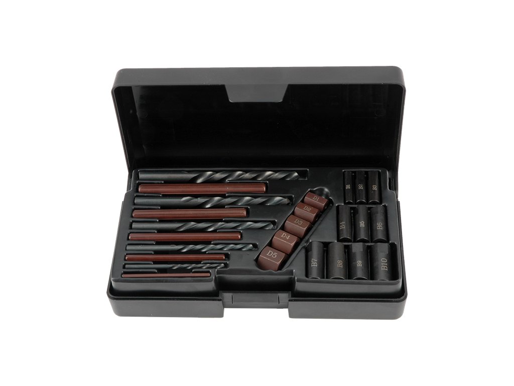 Setul este destinat dezasamblării şuruburilor deteriorate cu filete pe dreapta şi stânga, utilizând ştifturi de impact. Conţine echipamentul complet pentru acest scop: 5 buc burghie şi mandrine cu diametrul 1/8; 3/16; 1/4; 5/16; 11/32”. 10 bucşe de ghidare - diametre exterioare de 7; 7,1; 8,1; 9; 10,3; 10,5; 11,3; 12,5; 13; 14 mm - diametrul interior al şurubului 4,1; 4,2; 4,5; 4,8; 7(4x); 9,5; 9 mm. Pentru fiecare pereche burghiu + dorn sunt prevăzute două bucşe de ghidare.