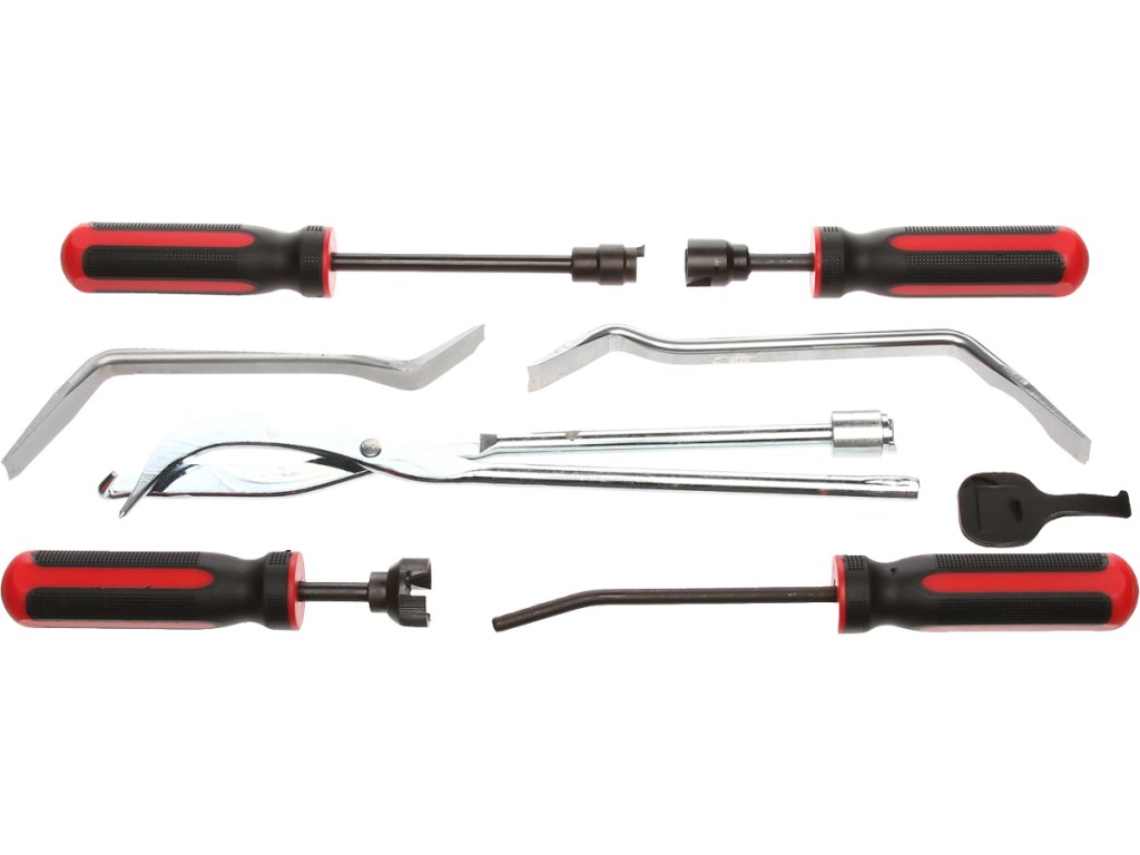 Kit de montaj pentru înlocuirea ferodourilor de frână, eventual alte reparații fa frâna cu tambur. Conține 8 ustensile, practic pentru orice frână cu tambur, clește de manipulare cu arcuri, dispozitiv pentru eliberarea siguranțelor ș.a. Ambalare în geantă din plastic.