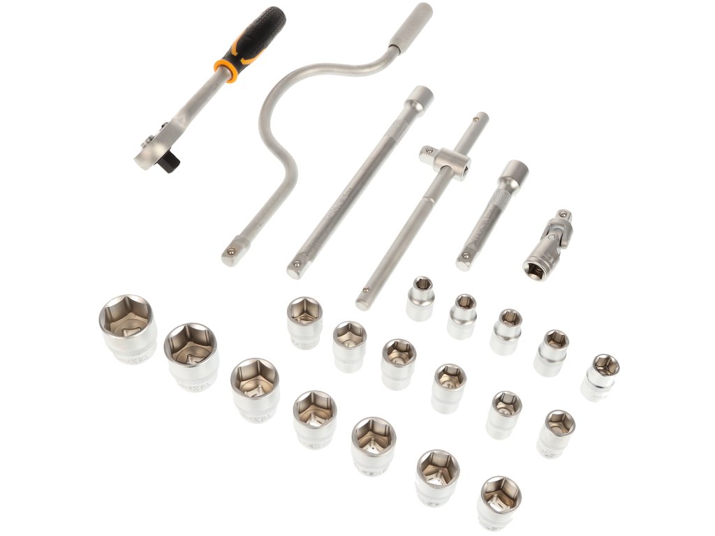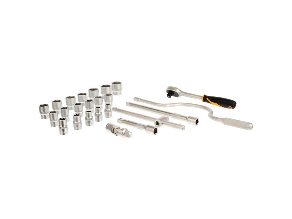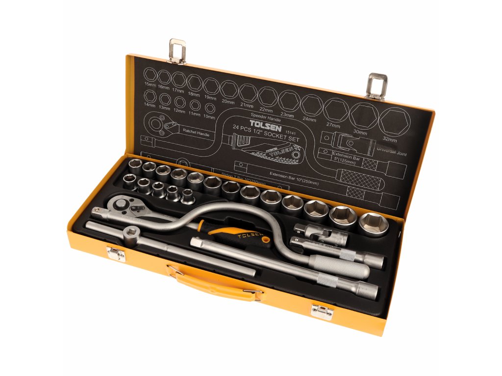 Include mecanism clichet de 1/2", adaptor articulat, adaptoare de prelungire 127 și 254 mm, mâner „T”, mâner curbat și capete tubulare 10,11,12,13,14,15,16,17,18,19, 20, 21 , 22, 23, 24, 27, 30 și 32 mm. Material oțel Cr-V, livrat într-o carcasă metalică.