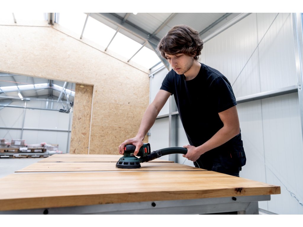 Șlefuire pad "multi-gaură" cu Velcro, 1 roată de șlefuire cu Velcro P 120 lemn și metal "profesional", Protector Ø 125 mm, Sac de praf textil compact, cheie Hex, metaBOX 215, fără celulă de baterie, fără încărcător