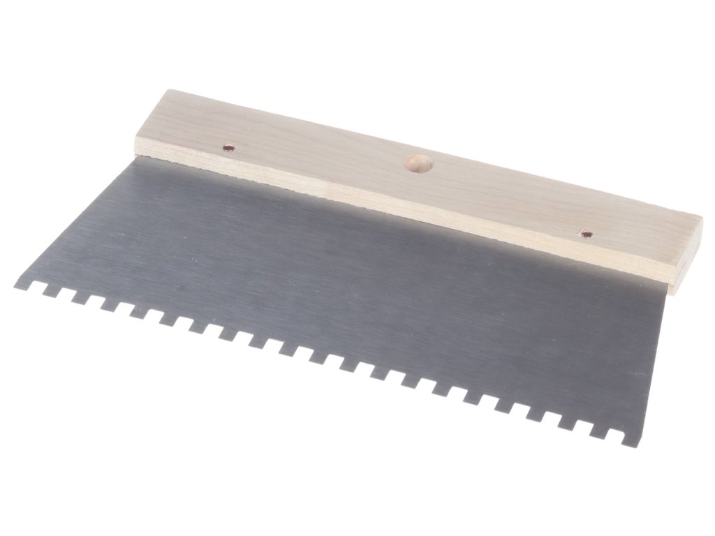 Spatulă pentru aplicarea adezivului pe faianţă şi gresie. Mâner din lemn Lungime 250 mm Dinţi 6 × 6 mm