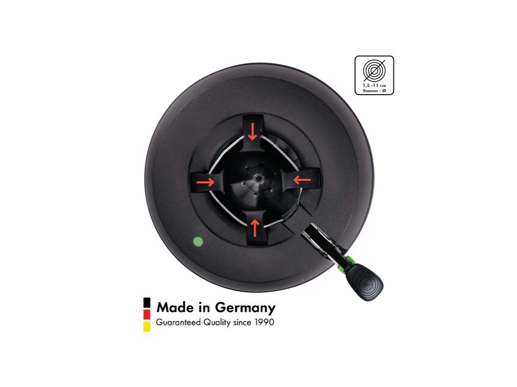 Seria KRINNER Green Line reflectă astfel convingerea companiei de familie că doar tratarea responsabilă a oamenilor și a mediului duce la succes pe termen lung. Calitatea înaltă și funcționalitatea produselor KRINNER Green Line S și M nu se datorează doar sigiliului de calitate „Fabricat în Germania”, ci și tehnologiei inovatoare care a caracterizat întotdeauna suporturile pentru brazi de Crăciun KRINNER: Toate suporturile pentru brazi de Crăciun KRINNER sunt echipate cu tehnologia originală dovedită a *cablului unic de oțel*, care asigură o presiune uniformă din partea suportului pe trunchi. Pur și simplu așezați bradul în suport, apăsați pedala și gata! Indiferent dacă bradul este gros, subțire sau strâmb, acesta stă în poziție stabilă și verticală.