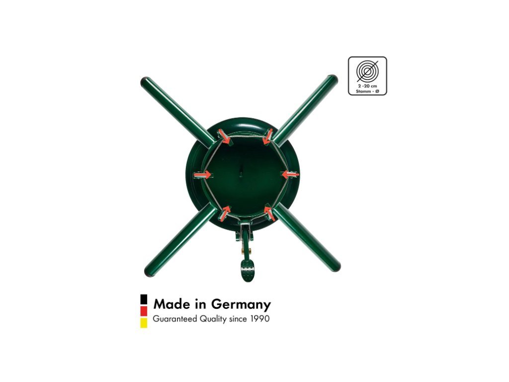 Suportul pentru brad de Crăciun Montana oferă cel mai stabil suport pentru brazi cu o înălțime de până la 4,90 metri. Suportul pentru brad de Crăciun este fabricat din oțel solid, iar greutatea proprie de 6,5 kg asigură un suport stabil. Suportul pentru brad de Crăciun este echipat cu tehnologia originală *full-surface single-rope*, care, datorită ghidării line a frânghiei, asigură o presiune uniformă a suporturilor pe trunchi. Pur și simplu așezați bradul în suport, apăsați pedala și gata! Indiferent dacă bradul este gros, subțire sau strâmb, acesta stă sigur și drept ca o coloană. Suport rezistent la intemperiipoate fi utilizat în interior și exterior.